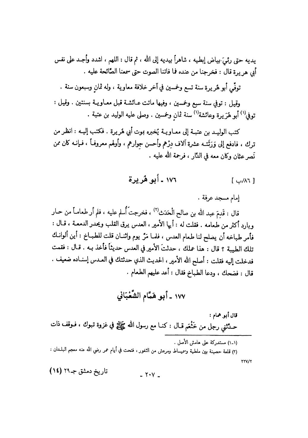 أبو هريرة سنة تسع وخمسين في آخر خلافة معاوية، وله ثمانٍ وسبعون سنة.