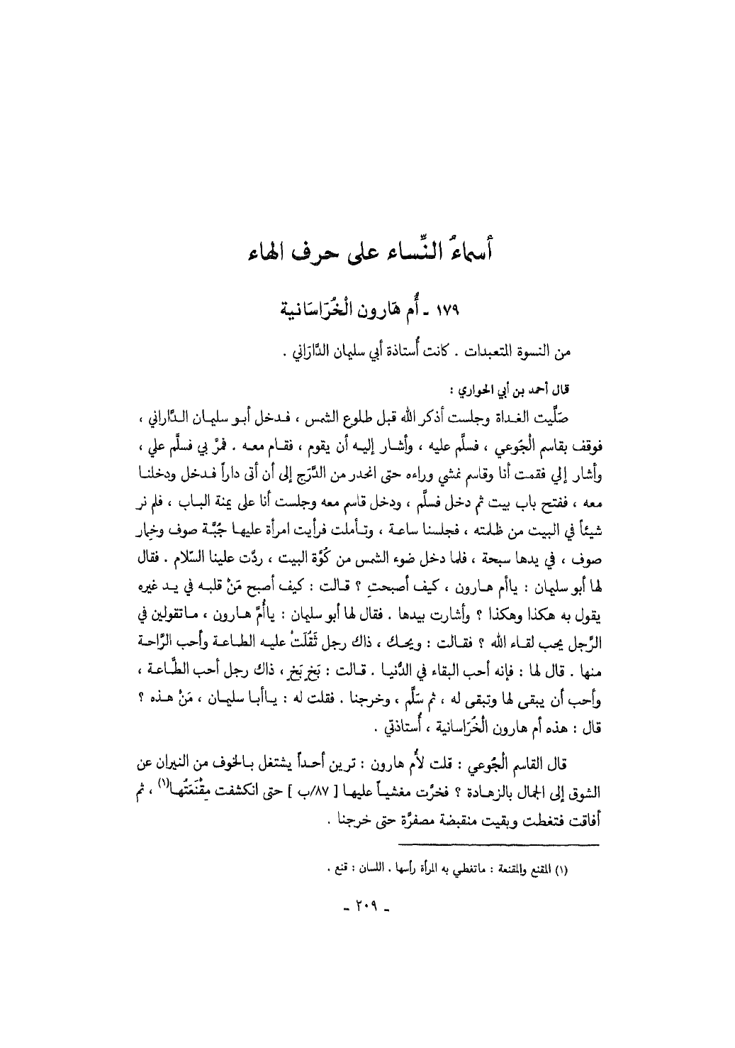 من النسوة المتعبدات. كانت أستاذة أبيسليمان الداراني. قال أحمد بن أبي الحواري: صليت الغداة وجلست أذكر الله قبل طلوع الشمس، فدخل أبو سليمان الداراني، فوقف بقاسم الجوعي، فسلم عليه، وأشار إليه أن يقوم، فقام معه. فمر بي فسلم علي، وأشار إلي فقمت أنا وقاسم نمشي وراءه حتى انحدر من الدرج إلى أن أتى داراً فدخل ودخلنا معه، ففتح باب بيت ثم دخل فسلم، ودخل قاسم معه وجلست أنا على يمنة الباب، فلم نر شيئاً في البيت من ظلمته، فجلسنا ساعة، وتأملت امرأة عليها جبة صوف وخمار صوف، في يدها سبحة، فلما دخل ضوء الشمس من كوة البيت، ردت علينا السلام. فقال لها أبو سليمان: يا أم هارون، كيف أصبحت؟ قالت: كيف أصبح من قلبه في يد غيره يقول به كذا وكذا؟ وأشارت بيدها. فقال لها أبو سليمان: يا أم هارون، ما تقولين في الرجل يحب لقاء الله؟ فقالت: ويحك، ذاك رجل ثقلت عليه الطاعة وأحب الراحة منها. قال لها: فإنه أحب البقاء في الدنيا. فقالت: بخٍ بخٍ، ذاك رجل أحب الطاعة، وأحب أن يبقى لها وتبقى له، ثم سلم، وخرجنا. فقلت له: يا أبا سليمان، من هذه؟ قال: هذه أم هارون الخراسانية، أستاذتي. قال القاسم الجوعي: قلت لأم هارون: ترين أحداً يشتغل بالخوف من النيران عن الشوق إلى الجمال بالزهادة؟ فخرت مغشياً عليها حتى انكشفت مقنعتها، ثم أفاقت فتغطت وبقيت منقبضة مصفرة حتى خرجنا.