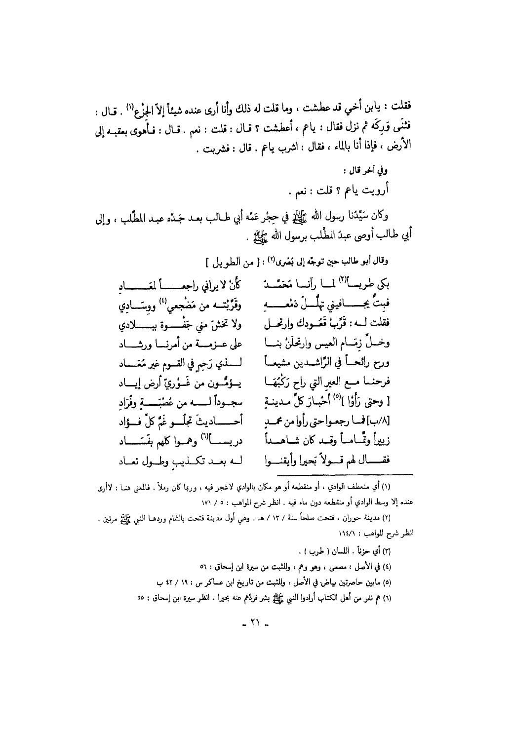 فقلت: يا ابن أخي قد عطشت، وما قلت له ذلك وأنا أرى عنده شيئاً إلا الجزع قال: فثنى وركه ثم نزل فقال: يا عم، أعطشت؟ قال: قلت: نعم. قال: فأهوى بعقبه إلى الأرض، فإذا أنا بالماء، فقال: اشرب يا عم. قال: فشربت. وفي آخر قال: أرويت يا عم؟ قلت: نعم. وكان سيدنا رسول الله صَلَّى اللهُ عَلَيْهِ وَسَلَّمَ في حجر عمه أبي طالب بعد جده عبد المطلب، وإلى أبي طالب أوصى عبد المطلب برسول الله صَلَّى اللهُ عَلَيْهِ وَسَلَّمَ.