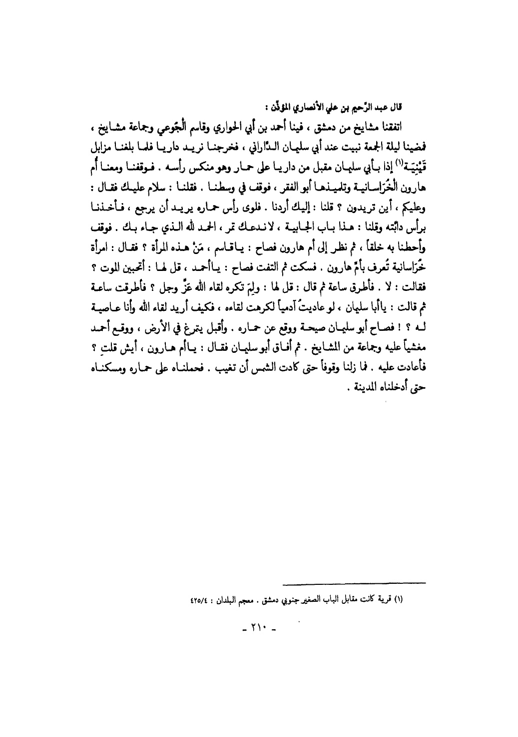 قال عبد الرحيم بن علي الأنصاري المؤذن: اتفقنا مشايخ من دمشق، فينا أحمد بن أبي الحواري وقاسم الجوعي وجماعة مشايخ، فمضينا ليلة الجمعة نبيت عند أبي سليمان الداراني، فخرجنا نريد داريا فلما بلغنا مزابل قينية إذ بأبي سليمان مقبل من داريا على حمار وهو منكس رأسه. فوقفنا ومعنا أم هارون الخراسانية وتلميذها أبو الفقر، فوقف في وسطنا. فقلنا: سلام عليك فقال: وعليكم، أين تريدون؟ قلنا: إليك أردنا. فلوى رأس حماره يريد أن يرجع، فأخذنا برأس دابته وقلنا: هذا باب الجابية، لا ندعك تمر، الحمد لله الذي جاء بك. فوقف وأحطنا به خلقاً، ثم نظر إلى أم هارون فصاح: يا قاسم، من هذه المرأة؟ فقال: امرأة خراسانية تعرف بأم هارون. فسكت ثم التفت فصاح: يا أحمد، قل لها: أتحبين الموت؟ فقالت: لا. فأطرق ساعة ثم قال: قل لها: ولم تكره لقاء الله عز وجل؟ فأطرقت ساعة ثم قالت: يا أبا سليمان، لو عاديت آدمياً لكرهت لقاءه، فكيف أريد لقاء الله وأنا عاصية له؟! فصاح أبو سليمان صيحة ووقع عن حماره. وأقبل يتمرغ في الأرض، ووقع أحمد مغشياً عليه وجماعة من المشايخ. ثم أفاق أبو سليمان فقال: يا أم هارون، إيش قلت؟ فأعادت عليه. فما زلنا وقوفاً حتى كادت الشمس أن تغيب. فحملناه على حماره ومسكناه حتى أدخلناه المدينة.