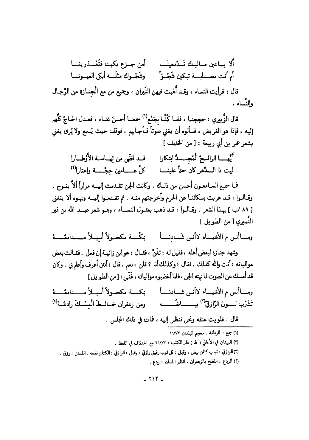 فما سمع السامعون أحسن من ذلك. وكانت الجن تقدمت إليه مراراً ألا ينوح. وقالوا: قد هربت بسكاننا عن الحرم وأخرجتهم منه. ثم تقدموا إليه ونهوه ألا يتغنى بهذا الشعر. وقالوا: قد ذهب بعقول النساء، وهو شعر عبد الله بن نمير النميري من الطويل: