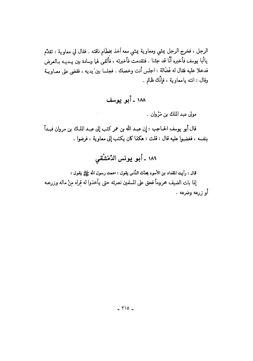 الرجل، فخرج الرجل يمشي ومعاوية يمشي معه آخذ بخطام ناقته. فقال لي معاوية: تقدم يا أبا يوسف فأخبره أنا قد جئنا. فتقدمت فأخبرته، فألقى لهما وسادة وبين يديه بالعرض فدخلا عليه فقال له فضالة: اجلس أنت وخصمك. فجلسا بين يديه، فقضى على معاوية وقال: انته يا معاوية، فإنك ظالم.