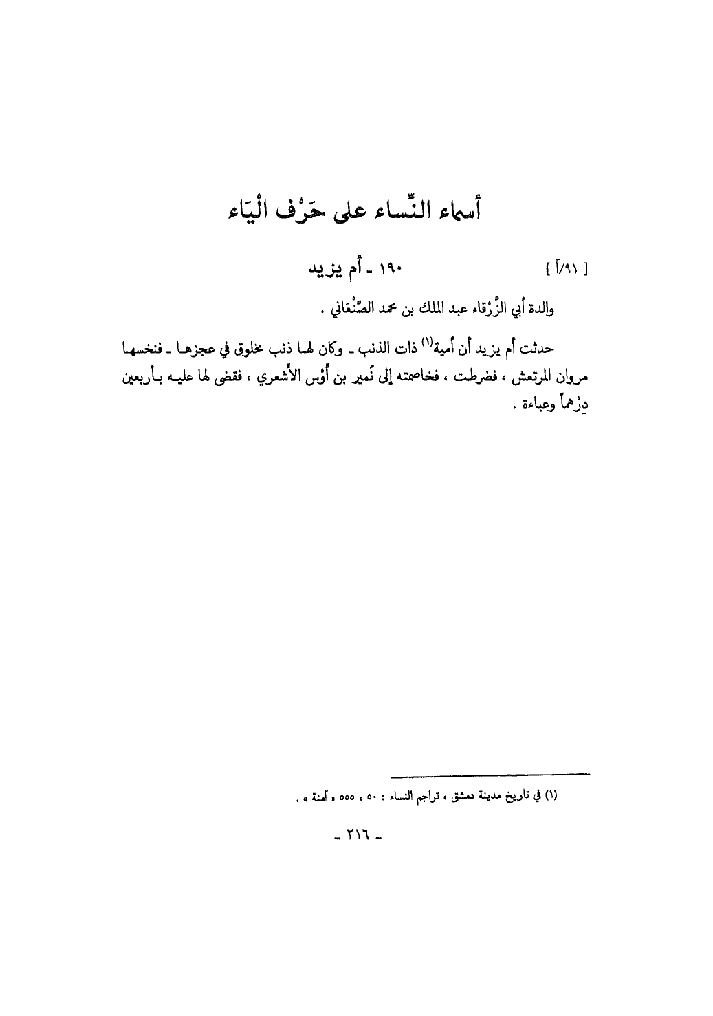 والدة أبي الزرقاء عبد الملك بن محمد الصنعاني. حدثت أم يزيد أن أمية ذات الذنب وكان لها ذنب مخلوق في عجزها فنخسها مروان المرتعش، فضرطت، فخاصمته إلى نمير بن أوس الأشعري، فقضى لها عليه بأربعين درهماً وعباءة.