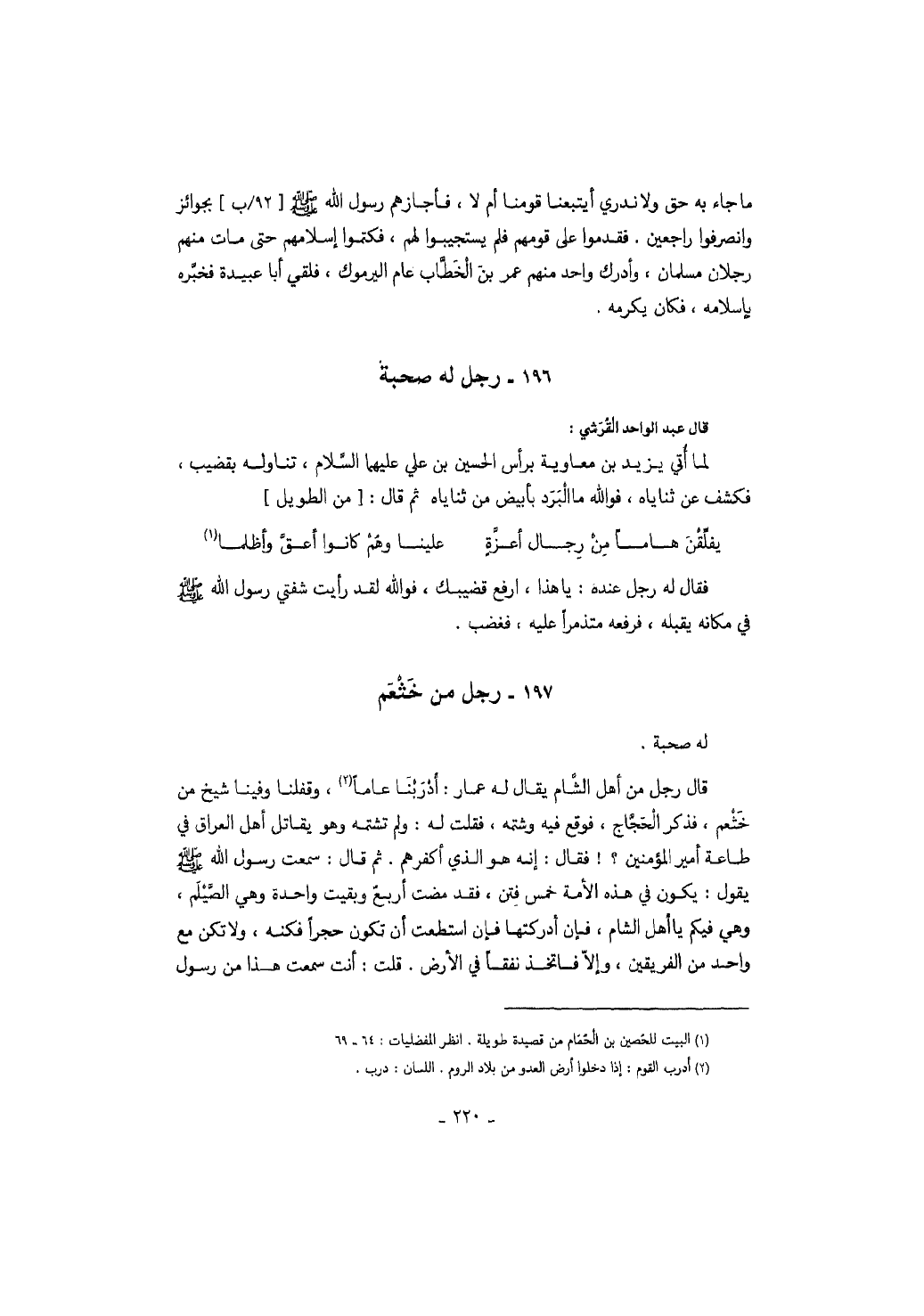 له صحبة. قال رجل من أهل الشام يقال له عمار: أدربنا عاماً، فقلنا وفينا شيخ من خثعم، فذكر الحجاج، فوقع فيه وشتمه، فقلت له: ولم تشتمه وهو يقاتل أهل العراق في طاعة أمير المؤمنين؟! فقال: إنه هو الذي أكفرهم. ثم قال: سمعت رسول الله صَلَّى اللهُ عَلَيْهِ وَسَلَّمَ يقول: يكون في هذه الأمة خمس فتن، فقد مضت أربع وبقيت واحدة وهي الصيلم، وهي فيكم يا أهل الشام، فإن أدركتها فإن استطعت أن تكون حجراً فكنه، ولا تكن مع واحد من الفريقين، وإلا فاتخذ نفقاً في الأرض. قلت: أنت سمعت هذا من رسول