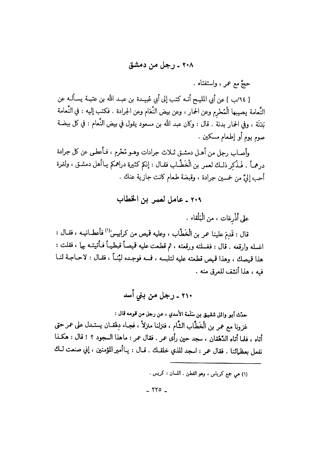 على أذرعات، من البلقاء. قال: قدم علينا عمر بن الخطاب، وعليه قميص من كرابيس أعطانيه، فقال: اغسله وارقعه. قال: فغسلته ورقعته، ثم قطعت عليه قميصاً قبطياً فأتيته بهما، فقلت: هذا قميصك، وهذا قميص قطعته عليه لتلبسه، فمسه فوجده ليناً، فقال: لا حاجة لنا فيه، هذا أنشف للعرق منه.