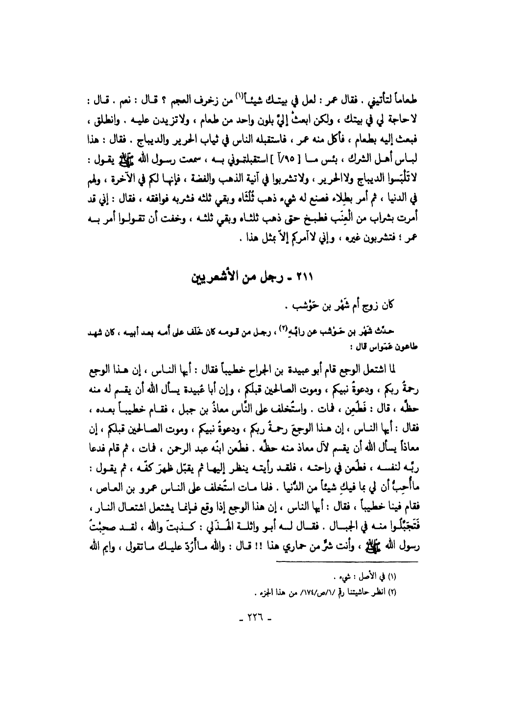 طعاماً لتأتيني. فقال عمر: لعل في بيتك شيئاً من زخرف العجم؟ قال: نعم. قال: لا حاجة لي في بيتك، ولكن ابعث إلي بلون واحد من طعام، ولا تزيدن عليه. وانطلق، فبعث إليه بطعام، فأكل منه عمر، فاستقبله الناس في ثياب الحرير والديباج. فقال: هذا لباس أهل الشرك، بئس ما استقبلتموني به، سمعت رسول الله صَلَّى اللهُ عَلَيْهِ وَسَلَّمَ يقول: لا تلبسوا الديباج ولا الحرير، ولا تشربوا في آنية الذهب والفضة، فإنها لكم في الآخرة، ولهم في الدنيا، ثم أمر بطلاء فصنع له شيء ذهب ثلثاه وبقي ثلثه فشربه فوافقه، فقال: إني قد أمرت بشراب من العنب فطبخ حتى ذهب ثلثاه وبقي ثلثه، وخفت أن تقولوا أمر به عمر؛ فتشربون غيره، وإني لا آمركم إلا بمثل هذا.