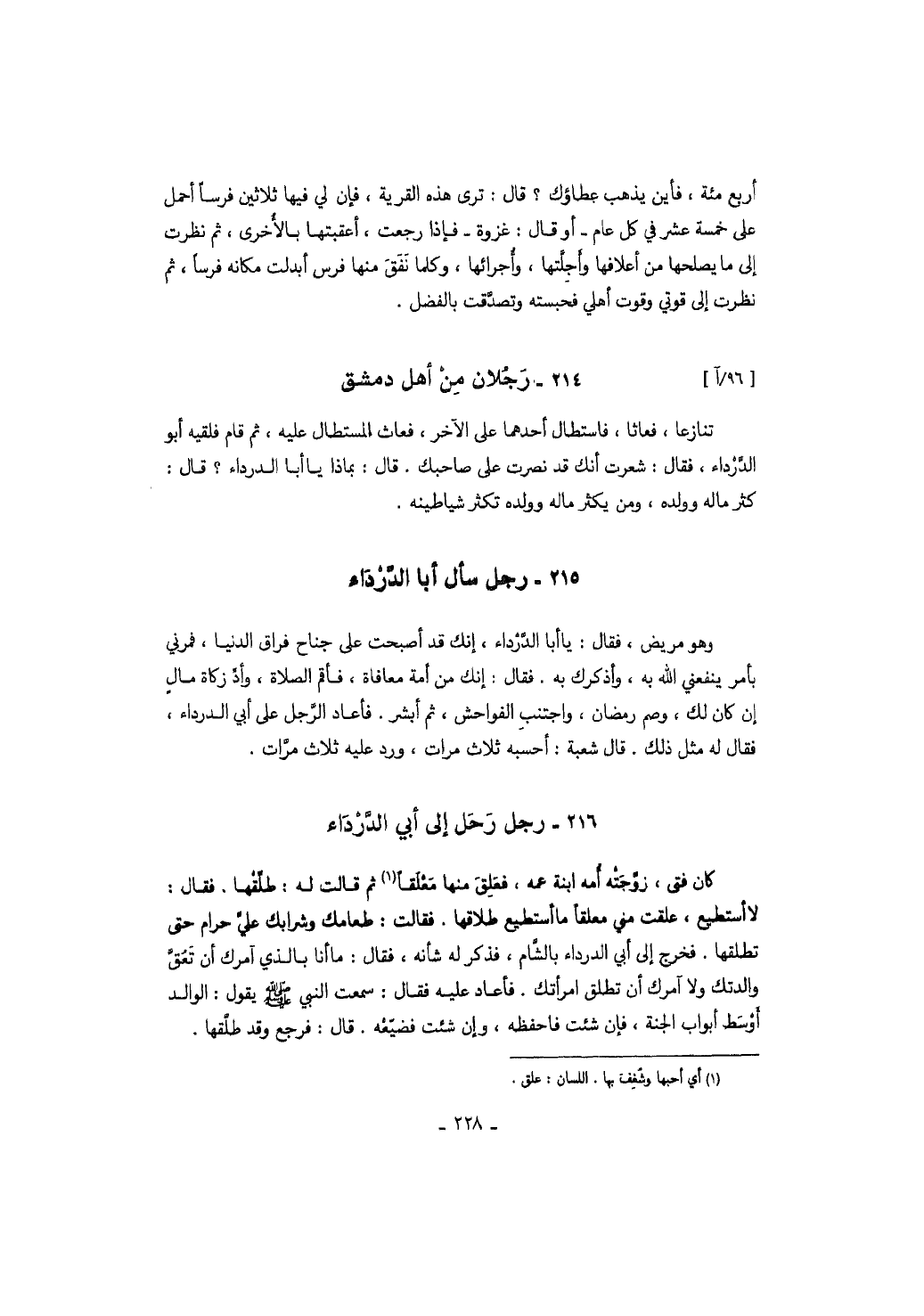 كان فتى، زوجته أمه ابنة عمه، فعلق منها معلقاً ثم قالت له: طلقها. فقال: لا أستطيع، علقت مني معلقاً ما أستطيع طلاقها. فقالت: طعامك وشرابك علي حرام حتى تطلقها. فخرج إلى أبي الدرداء بالشام، فذكر له شأنه، فقال: ما أنا الذي آمرك أن تعق والدتك ولا آمرك أن تطلق امرأتك. فأعاد عليه فقال: سمعت النبي صَلَّى اللهُ عَلَيْهِ وَسَلَّمَ يقول: الوالد أوسط أبواب الجنة، فإن شئت فاحفظه، وإن شئت فضيعه. قال: فرجع وقد طلقها.