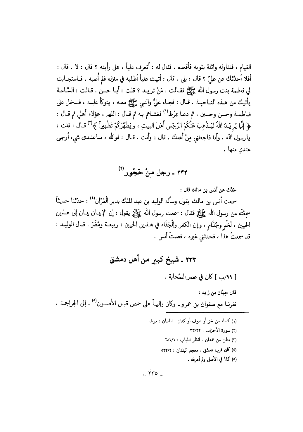 القيام، فتناوله واثلة بثوبه فأقعده. فقال له: أتعرف علياً، هل رأيته؟ قال: لا. قال: أفلا أحدثك عن علي؟ قال: بلى. قال: أتيت علياً أطلبه في منزله فلم أصبه، فاستجابت لي فاطمة بنت رسول الله صَلَّى اللهُ عَلَيْهِ وَسَلَّمَ فقالت: من تريد؟ قلت: أبا حسن. قالت: الساعة يأتيك من هذه الناحية. قال: فجاء علي والنبي صَلَّى اللهُ عَلَيْهِ وَسَلَّمَ معه، يتوكأ عليه، فدخل على فاطمة وحسن وحسين، ثم دعا بمرط فغشاهم به ثم قال: اللهم، هؤلاء أهلي ثم قال: " إنما يريد الله ليذهب عنكم الرجس أهل البيت، ويطهركم تطهيراً " قال: قلت: يا رسول الله، وأنا فاجعلني من أهلك. قال: وأنت. قال: فوالله ما عندي شيء أرجى عندي منها.
