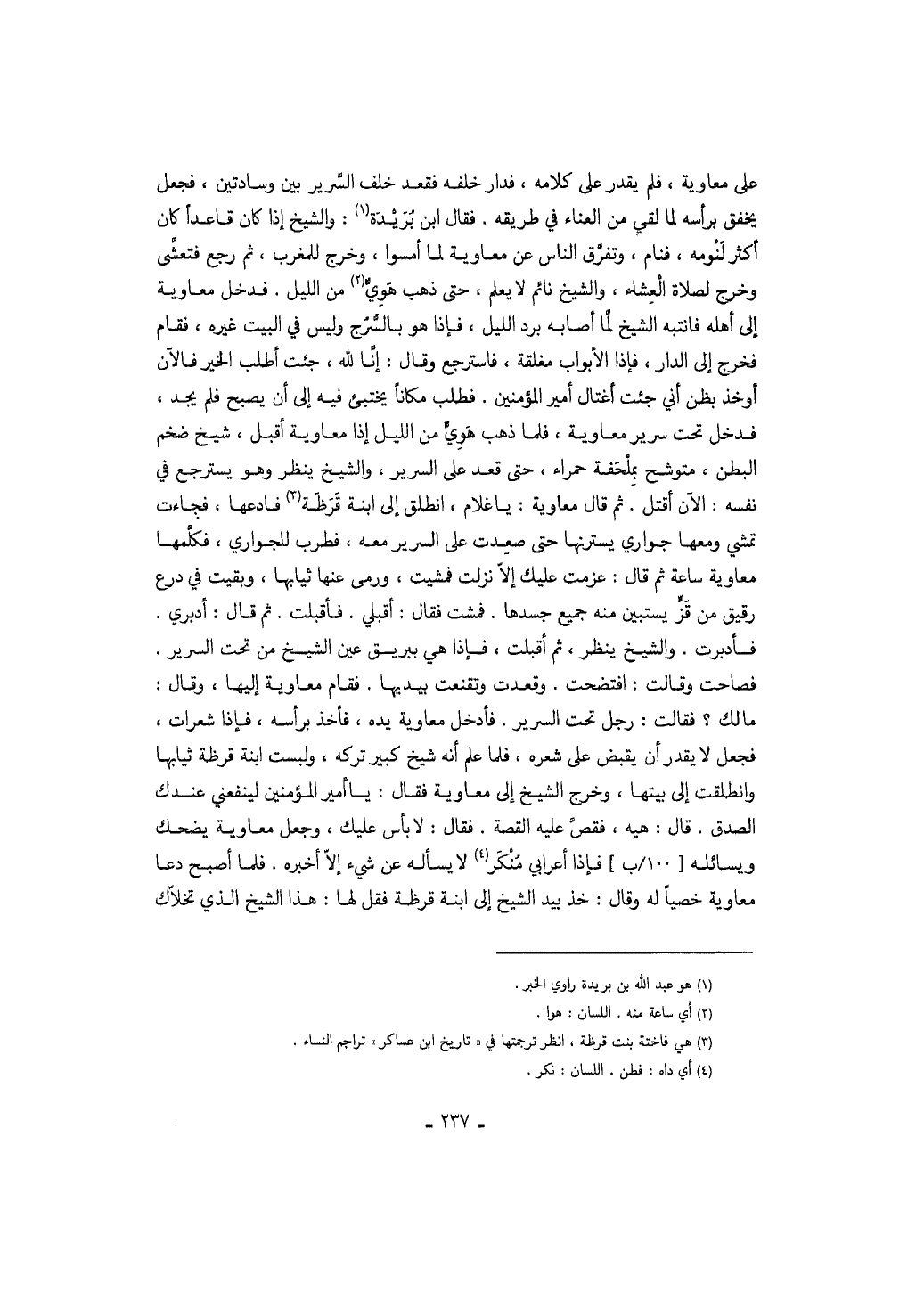 على معاوية، فلم يقدر على كلامه، فدار خلفه فقعد خلف السرير بين وسادتين، فجعل يخفق برأسه لما لقي من العناء في طريقه. فقال ابن بريدة: والشيخ إذا كان قاعداً كان أكثر لنومه، فنام، وتفرق الناس عن معاوية لما أمسوا، وخرج للمغرب، ثم رجع فتعشى وخرج لصلاة العشاء، والشيخ نائم لا يعلم، حتى ذهب هوي من الليل. فدخل معاوية إلى أهله فانتبه الشيخ لما أصابه برد الليل، فإذا هو بالسرج وليس في البيت غيره، فقام فخرج إلى الدار، فإذا الأبواب مغلقة، فاسترجع وقال: إنا لله، جئت أطلب الخير فالآن أوخذ بظن أني جئت أغتال أمير المؤمنين. فطلب مكاناً يختبئ فيه إلى أن يصبح فلم يجد، فدخل تحت سرير معاوية فلما ذهب هوي من الليل إذا معاوية أقبل، شيخ ضخم البطن، متوشح بملحفة حمراء، حتى قعد على السرير، والشيخ ينظر وهو يسترجع في نفسه: الآن أقتل. ثم قال معاوية: يا غلام، انطلق إلى ابنة قرظة فادعها، فجاءت تمشي ومعها جواري يسترنها حتى صعدت على السرير معه، فطرب للجواري، فكلمها معاوية ساعة ثم قال: عزمت عليك إلا نزلت فمشيت، ورمى عنها ثيابها، وبقيت في درع رقيق من قز يستبين منه جميع جسدها. فمشت فقال: أقبلي. فأقبلت. ثم قال: أدبري. فأدبرت. والشيخ ينظر، ثم أقبلت، فإذا هي ببريق عين الشيخ من تحت السرير. فصاحت وقالت: افتضحت. وقعدت وتقنعت بيديها. فقام معاوية إليها، وقال: ما لك؟ فقالت: رجل تحت السرير. فأدخل معاوية يده، فأخذ برأسه، فإذا شعرات، فجعل لا يقدر أن يقبض على شعره، فلما علم أنه شيخ كبير تركه ولبست ابنة قرظة ثيابها وانطلقت إلى بيتها، وخرج الشيخ إلى معاوية فقال: يا أمير المؤمنين لينفعني عندك الصدق. قال: هيه، فقص عليه القصة. فقال: لا بأس عليك، وجعل معاوية يضحك ويسأله فإذا أعرابي منكر لا يسأله عن شيء إلا أخبره. فلما أصبح دعا معاوية خصياً له وقال: خذ بيد الشيخ إلى ابنة قرظة فقل لها: هذا الشيخ الذي تخلاك