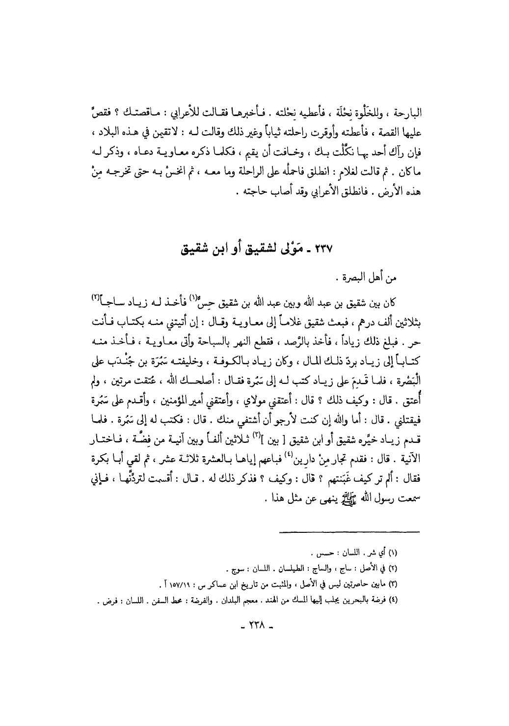 من أهل البصرة. كان بين شقيق بن عبد الله وبين عبد الله بن شقيق حس فأخذ له زياد ساجاً بثلاثين ألف درهم، فبعث شقيق غلاماً إلى معاوية وقال: إن أتيتني منه بكتاب فأنت حر. فبلغ ذلك زياداً، فأخذ بالرصد، فقطع النهر بالسباحة، وأتى معاوية، فأخذ منه كتاباً إلى زياد برد ذلك المال، وكان زياد بالكوفة، وخليفته سمرة بن جندب على البصرة، فلما قدم على زياد كتب له إلى سمرة فقال: أصلحك الله عتقت مرتين، ولم أعتق. قال: وكيف ذلك؟ قال: اعتقني يا مولاي، وأعتقني أمير المؤمنين، وأقدم على سمرة فيقتلني. قال: أما والله إن كنت لأرجو أن أشتفي منك. قال: فكتب إلى سمرة. فلما قدم إلى زياد خيره شقيق أو ابن شقيق بين ثلاثين ألفاً وبين آنية من الفضة، فاختار الآنية. قال: فقدم تجار من دارين فباعهم إياها بالعشرة ثلاثة عشر، ثم لقي أبا بكرة فقال: ألم تر كيف غبنتهم؟ قال: وكيف؟ فذكر ذلك له. قال: أقسمت لتردنها. فإني سمعت رسول الله صَلَّى اللهُ عَلَيْهِ وَسَلَّمَ ينهى عن مثل هذا.