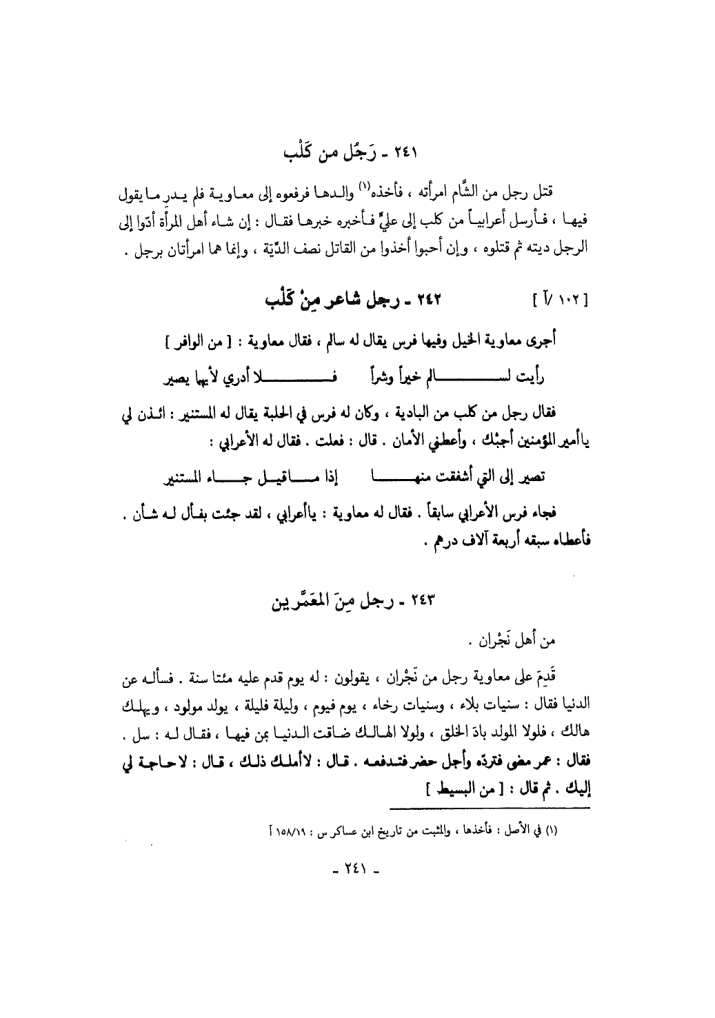 من أهل نجران. قدم على معاوية رجل من نجران، يقولون: له يوم قدم عليه مئتا سنة. فسأله عن الدنيا فقال: سنيات بلاء، وسنيات رخاء، يوم فيوم، وليلة فليلة، يولد مولود، ويهلك هالك، فلولا المولد باد الخلق، ولولا الهالك ضاقت الدنيا بمن فيها، فقال له: سل. فقال: عمر مضى فترده وأجل حضر فتدفعه. قال: لا أملك ذلك، قال: لا حاجة لي إليك ثم قال: من البسيط