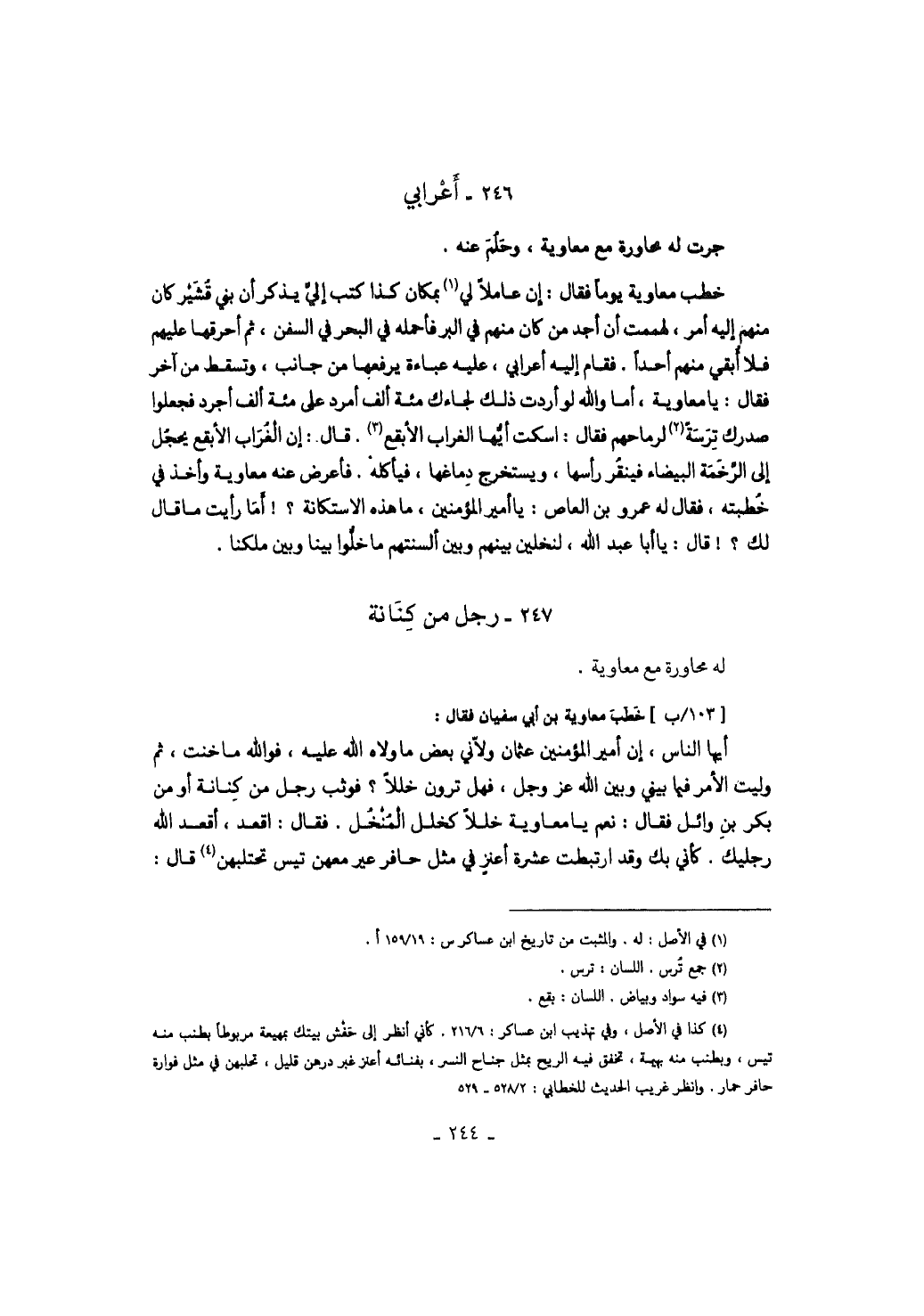 له محاورة مع معاوية. خطب معاوية بن أبي سفيان فقال: أيها الناس، إن أمير المؤمنين عثمان ولاني بعض ما ولاه الله عليه، فوالله ما خنت، ثم وليت الأمر فيما بيني وبين الله عز وجل، فهل ترون خللاً؟ فوثب رجل من كنانة أو من بكر بن وائل فقال: نعم يا معاوية خللاً كخلل المنخل. فقال: اقعد أقعد الله رجليك. كأني بك وقد ارتبطت عشرة أعنزٍ في مثل حافر عير معهن تيس تحتلبهن قال:
