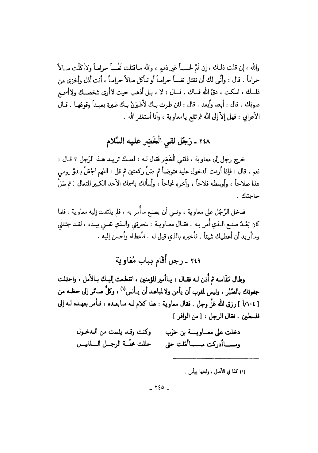 خرج رجل إلى معاوية، فلقي الخضر فقال له: لعلك تريد هذا الرجل؟ قال: نعم. قال: فإذا أردت الدخول عليه فتوضأ ثم صل ركعتين ثم قل: اللهم اجعل بدو يومي هذا صلاحاً، وأوسطه فلاحاً، وآخره نجاحاً، وأسألك باسمك الأحد الكبير المتعال: ثم سل حاجتك.