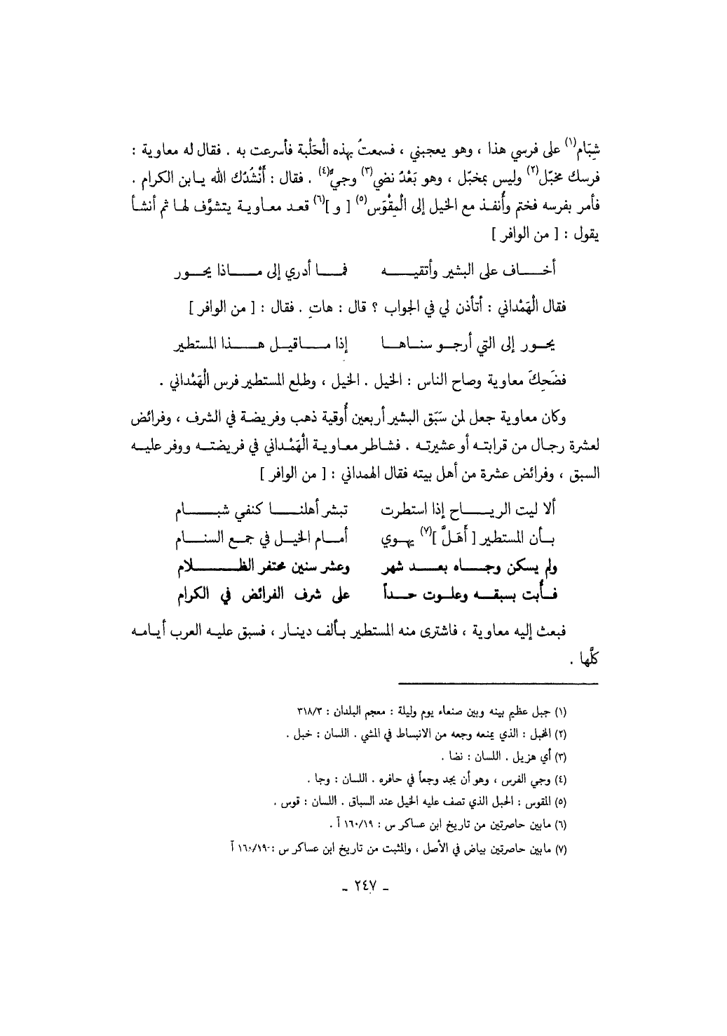 شبام على فرسي هذا، وهو يعجبني، فسمعت بهذه الحلبة فأسرعت به. فقال له معاوية: فرسك مخبل وليس بمخبل، وهو بعد نضي وجي. فقال أنشدك الله يا بن الكرام. فأمر بفرسه فختم وأنفذ مع الخيل إلى المقوس وقعد معاوية يتشوف لها ثم أنشأ يقول: من الوافر