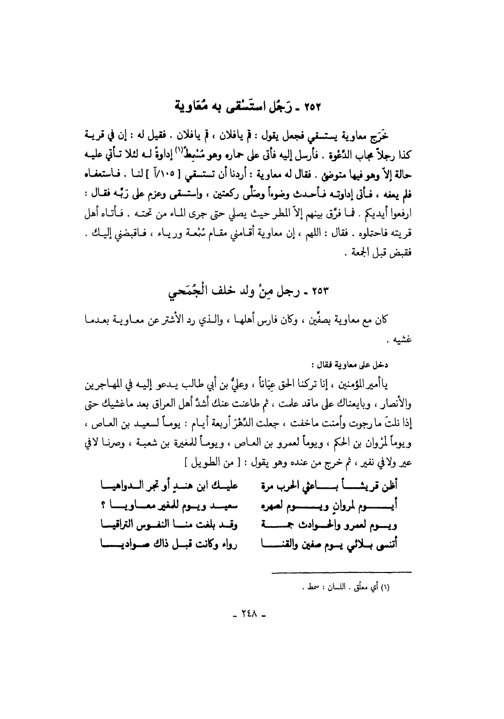 خرج معاوية يستسقي فجعل يقول: قم يا فلان، قم يا فلان. فقيل له: إن في قرية كذا رجلاً مجاب الدعوة. فأرسل إليه فأتى على حماره وهو مسمط إداوةً له لئلا تأتي عليه حالة إلا وهو فيها متوضئ. فقال له معاوية: أردنا أن تستسقي لنا. فاستعفاه فلم يعفه، فأتى إداوته فأحدث وضوءاً وصلى ركعتين، واستسقى وعزم على ربه فقال: ارفعوا أيديكم. فما فرق بينهم إلا المطر حيث يصلي حتى جرى الماء من تحته. فأتاه أهل قريته فاحتملوه. فقال: اللهم، إن معاوية أقامني مقام سمعة ورياء، فاقبضني إليك. فقبض قبل الجمعة.