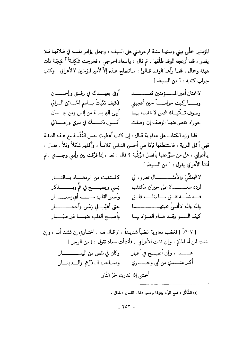 المؤمنين خلى بيني وبينها سنة ثم عرضني على السيف، وجعل يؤامر نفسه في طلاقها فلا يقدر، فلما أزعجه الوفد طلقها. ثم قال: يا سعاد اخرجي، فخرجت شكلة غنجة ذات هيئة وجمال، فلما رآها الوفد قالوا: ما تصلح هذه إلا لأمير المؤمنين لا لأعرابي. وكتب جواب كتابه: من البسيط