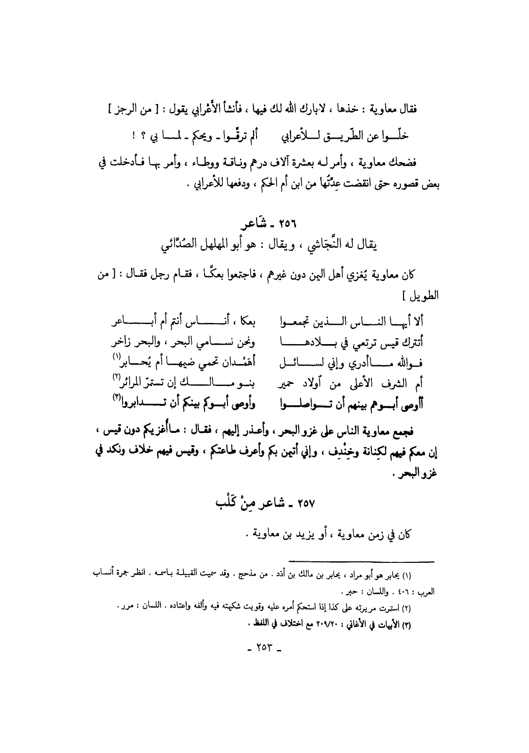 فقال معاوية: خذها لا بارك الله لك فيها، فأنشأ الأعرابي يقول: من الرجز