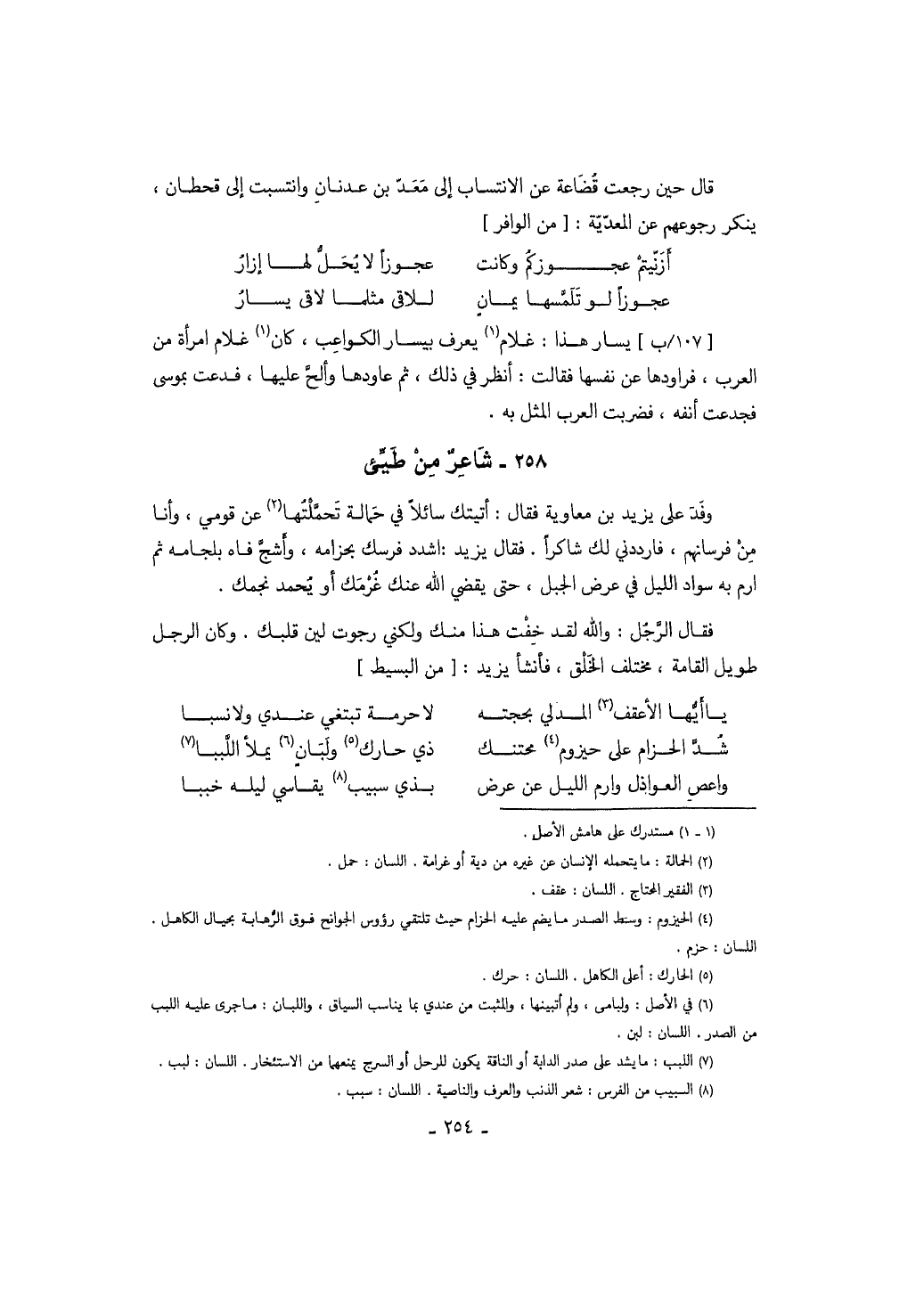قال حين رجعت قضاعة عن الانتساب إلى معد بن عدنان وانتسب إلى قحطان، ينكر رجوعهم عن المعدية: من الوافر