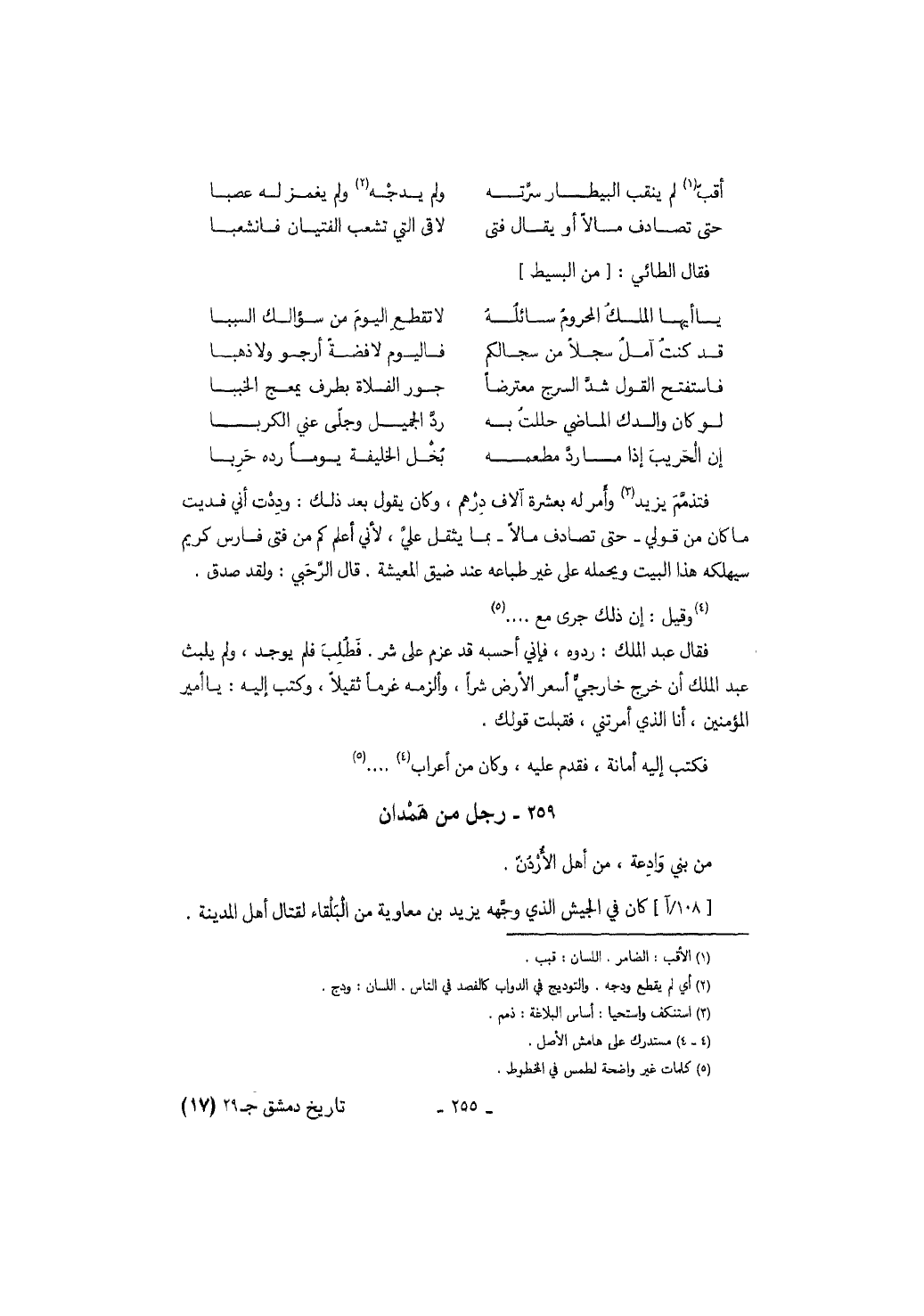 فتذمم يزيد وأمر له بعشرة آلاف درهم، وكان يقول بعد ذلك: وددت أني فديت ما كان من قولي حتى تصادف مالاً بما يثقل علي لأني أعلم كم من فتى فارس كريم سيهلكه هذا البيت ويحمله على طباعه عند ضيق المعيشة. قال الرحبي: وقد صدق. وقيل: إن ذلك جرى مع.... فقال عبد الملك: ردوه، فإني أحسبه قد عزم على شر. فطلب فلم يوجد، ولم يلبث عبد الملك أن خرج خارجي أسعر الأرض شراً، وألزمه غرماً ثقيلاً، وكتب إليه: يا أمير المؤمنين، أنا الذي أمرتني، فقبلت قولك. فكتب إليه أمانة، فقدم عليه، وكان من أعراب.