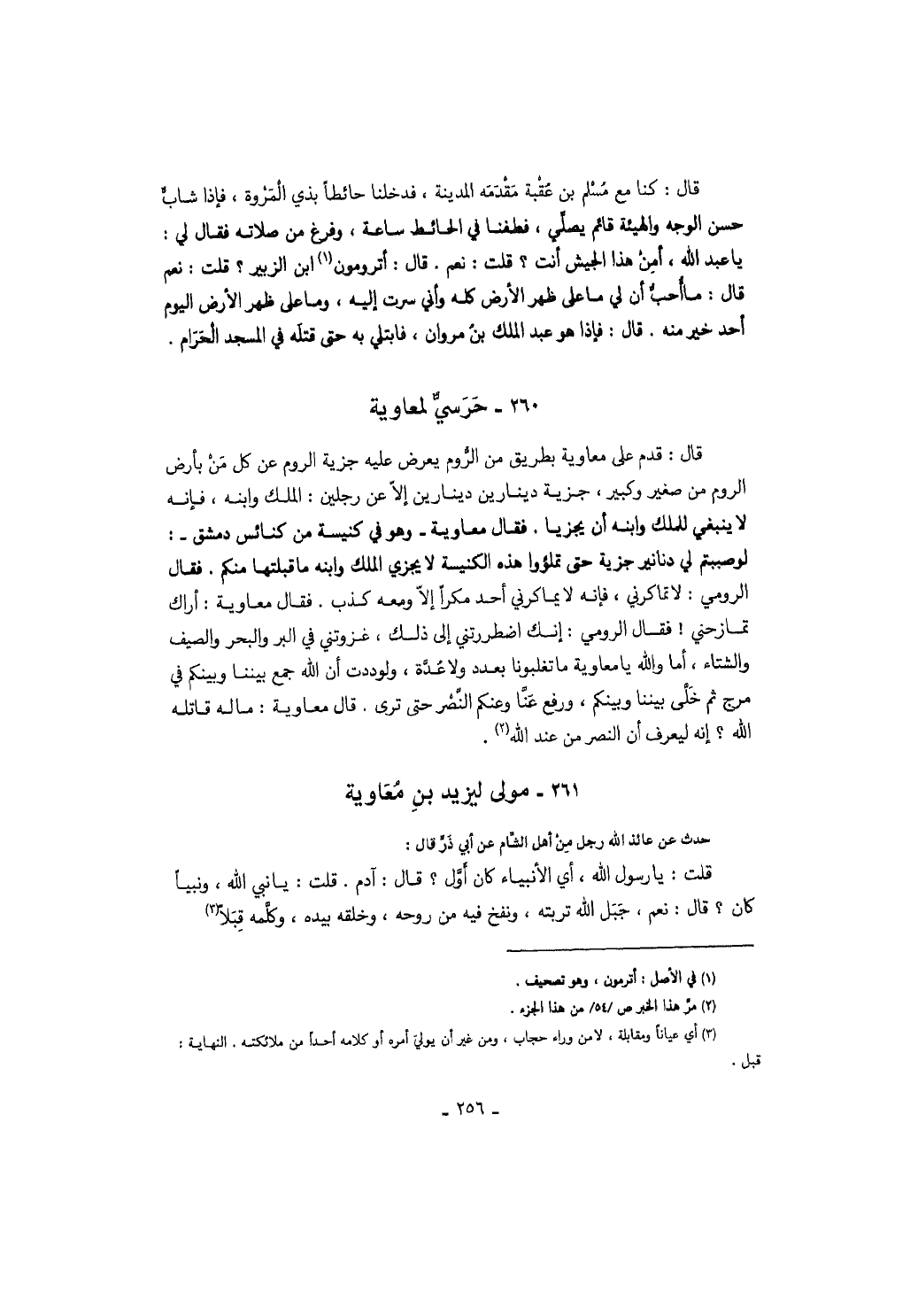 قال: قدم على معاوية بطريق من الروم يعرض عليه جزية الروم عن كل من بأرض الروم من صغير وكبير، جزية دينارين دينارين إلا عن رجلين: الملك وابنه، فإنه لا ينبغي للملك وابنه أن يجزيا. فقال معاوية وهو في كنيسة من كنائس دمشق: لو صببتم لي دنانير جزية حتى تملؤوا هذه الكنيسة لا يجزي الملك وابنه ما قبلتها منكم. فقال الرومي: لا تماكرني، فإنه لا يماكرني أحد مكراً إلا ومعه كذب. فقال معاوية: أراك تمازحني! فقال الرومي: إنك اضطررتني إلى ذلك، غزوتني في البر والبحر والصيف والشتاء، أما والله يا معاوية ما تغلبونا بعدد ولا عدة، ولوددت أن الله جمع بيننا وبينكم في مرج ثم خلى بيننا وبينكم، ورفع عنا وعنكم النصر حتى ترى. قال معاوية: ما له قاتله الله؟ إنه ليعرف أن النصر من عند الله.