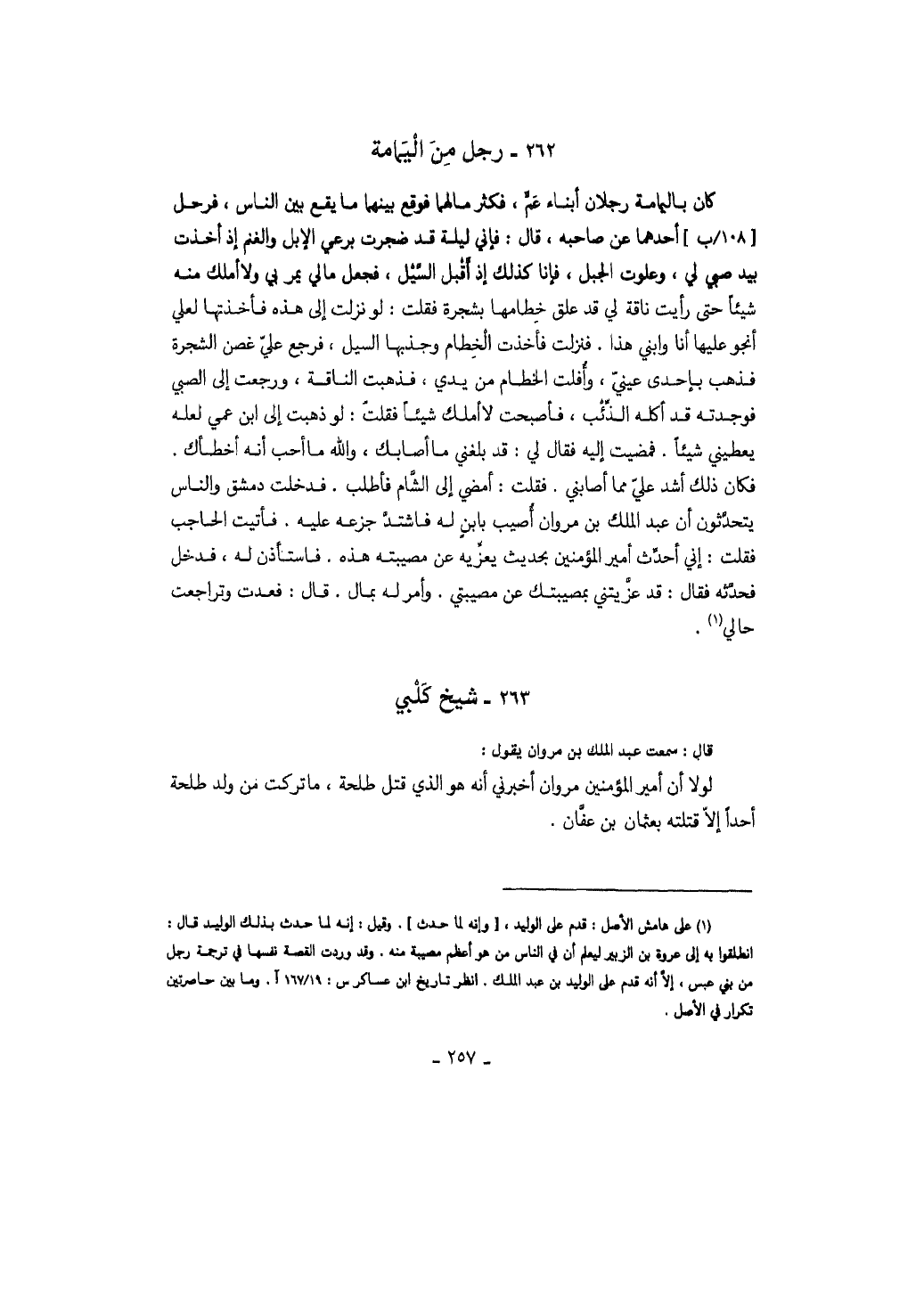 قال: سمعت عبد الملك بن مروان يقول: لولا أن أمير المؤمنين مروان أخبرني أن هو الذي قتل طلحة، ما تركت من ولد طلحة أحداً إلا قتلته بعثمان بن عفان.