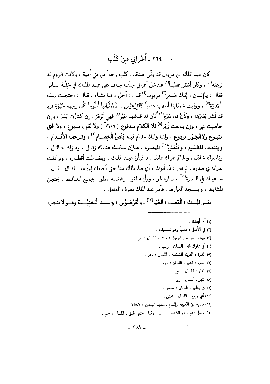 كان عبد الملك بن مروان قد ولى صدقات كلب رجلاً من بني أمية، وكانت الروم قد نزعته، وكان أشقر عصباً فدخل أعرابي جلف جاف على عبد الملك في خفة الناس فقال: يا إنسان، إنك مدبر مربوب قال: أجل، فما تشاء. قال: أحتجبت بهذه المدرة، ووليت خطابنا أصهب عصباً كالقرعوس، طمطمانياً أطوماً كأن وجهه جهوة قرد قد قشر بصرها، وكأن فاه سرم أتان قد قاشها عير فهي ترمز، إن كشرت بسر وإن خاطبت نهر، وإن بالغت زبر فلا الكلام مدفوع ولا القول مسموع، ولا الحق متبوع ولا الجور مردوع، ولنا مقام فيه ينص الخصام، وتزحف الأقدام، وينتصف المظلوم، وينعش المهضوم، ها إن ملكك هناك زائل، وعزك حائل، وناصرك خاذل، والحاكم عليك عادل. فاكبأن عبد الملك، وتضاءلت أقطاره، وترادفت عبراته في صدره. ثم قال: لله أبوك، أي ظلم نالك منا حتى أجاءك إلى هذا المقال. قال: ساعيك في السماوة، نهاره لهو، ورأيه لغو، وغضبه سطو، يجمع المناقط، يحتجن المشايط، ويستنجد العمارط. فأمر عبد الملك بصرف العامل.