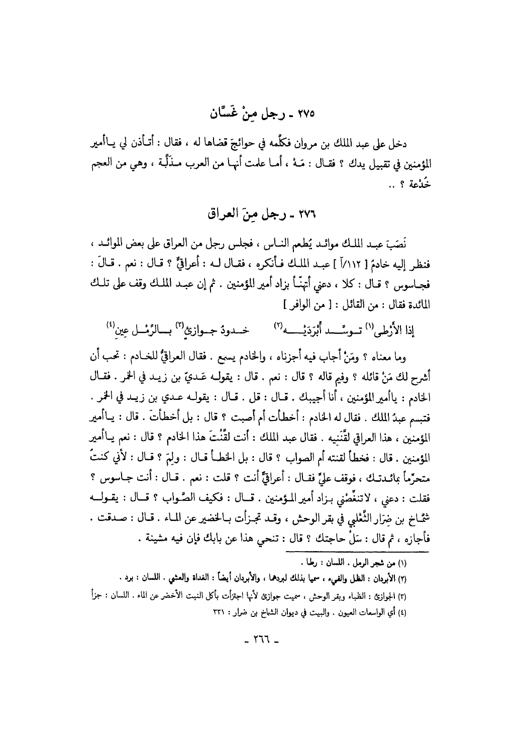 وما معناه؟ ومن أجاب فيه أجزناه، والخادم يسمع. فقال العراقي للخادم: تحب أن أشرح لك من قائله؟ وفيما قاله؟ قال: نعم. قال: يقول عدي بن زيد في الخمر. فقال الخادم: يا أمير المؤمنين، أنا أجيبك. قال: قل. قال: يقول عدي بن زيد في الخمر. فتبسم عبد الملك. فقال له الخادم: أخطأت أم أصبت؟ قال: بل أخطأت. قال: يا أمير المؤمنين، هذا العراقي لقننيه. فقال عبد الملك: أنت لقنت هذا الخادم؟ قال: نعم يا أمير المؤمنين. قال: فخطأ لقتنته أم الصواب؟ قال: بل الخطأ قال: ولم؟ قال: لأني كنت متحرماً بمائدتك، فوقف علي فقال: أعراقي أنت؟ قلت: نعم. قال: أنت جاسوس فقلت: دعني لا تنغصني بزاد أمير المؤمنين. قال: فكيف الصواب؟ قال: يقوله شماخ بن ضرار الثعلبي في بقر الوحش، وقد تجزأت بالخضير عن الماء. قال: صدقت. فأجازه، ثم قال: سل حاجتك؟ قال: تنحي هذا عن بابك فإن فيه مشينة.