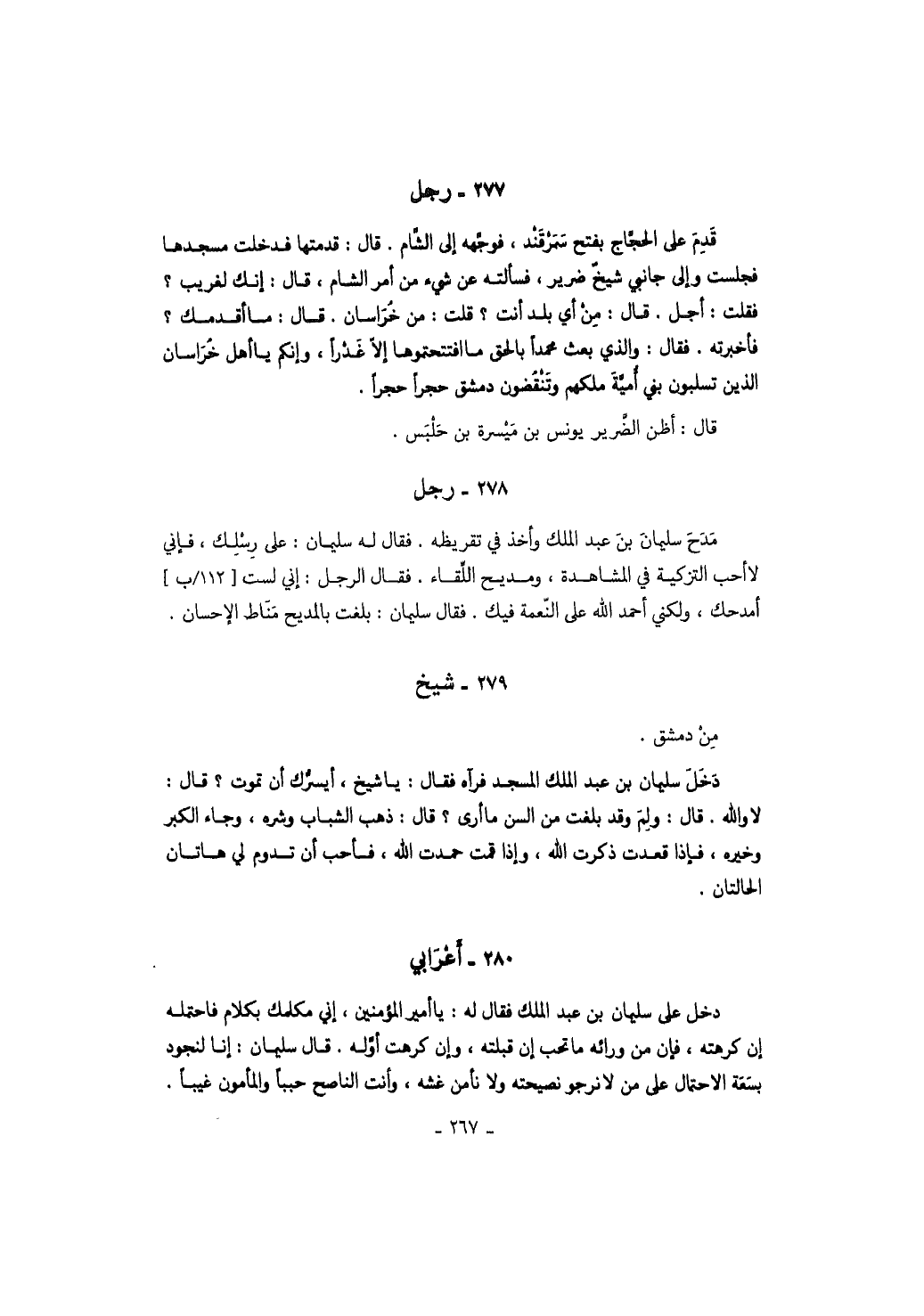 فوجهه إلى الشام. قال: قدمتها فدخلت مسجدها فجلست وإلى جانبي شيخ ضرير، فسألته عن شيء من أمر الشام، قال: إنك لغريب؟ فقلت: أجل. قال: من أي بلد أنت؟ قلت: من خراسان. قال: ما أقدمك؟ فأخبرته. فقال: والذي بعث محمداً بالحق ما افتتحتموها إلا غدراً، وأنكم يا أهل خراسان الذين تسلبون بني أمية ملكهم وتنقضون دمشق حجراً حجراً. قال: أظن الضرير يونس بن ميسرة بن حلبس.