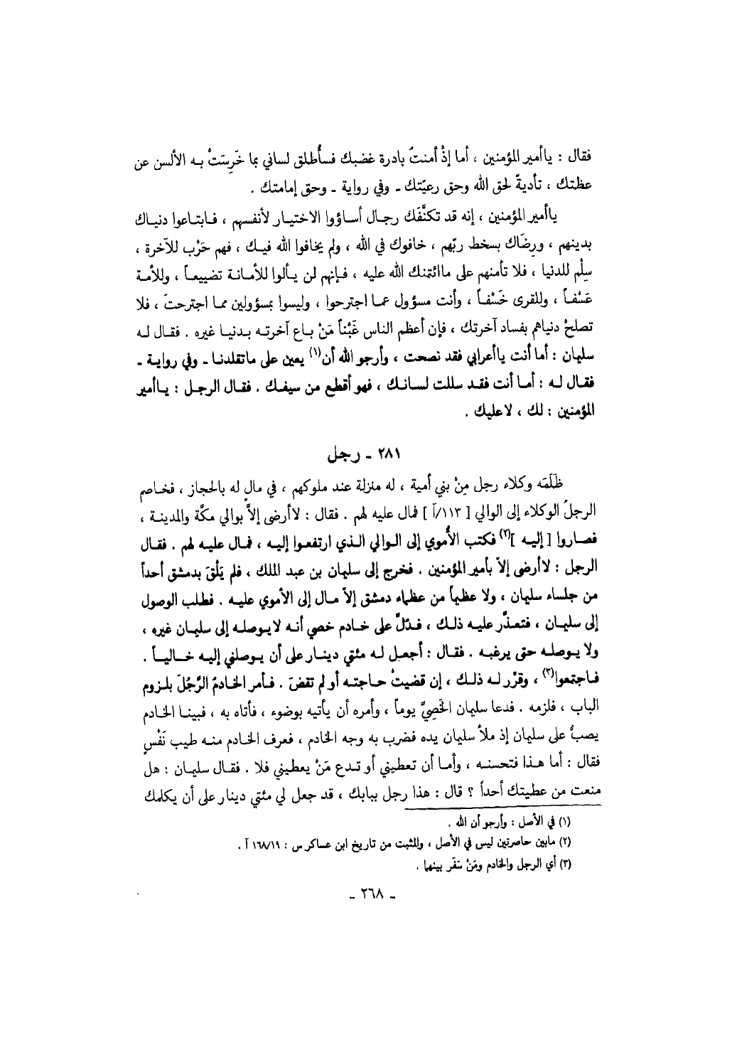 له منزلة عند ملوكهم، في مال له بالحجاز، فخاصم الرجل الوكلاء إلى الوالي فمال عليه لهم. فقال: لا أرضى إلا بوالي مكة والمدينة، فصاروا إليه فكتب الأموي إلى الوالي الذي ارتفعوا إليه، فمال عليه لهم، فقال الرجل: لا أرضى إلا بأمير المؤمنين. فخرج إلى سليمان بن عبد الملك، فلم يلق بدمشق أحداً من جلساء سليمان، ولا عظيماً من عظماء دمشق إلا مال إلى الأموي عليه. فطلب الوصول إلى سليمان، فتعذر عليه ذلك، فدل على خادم خصي أنه لا يوصله إلى سليمان غيره، ولا يوصله حتى يرغبه. فقال: