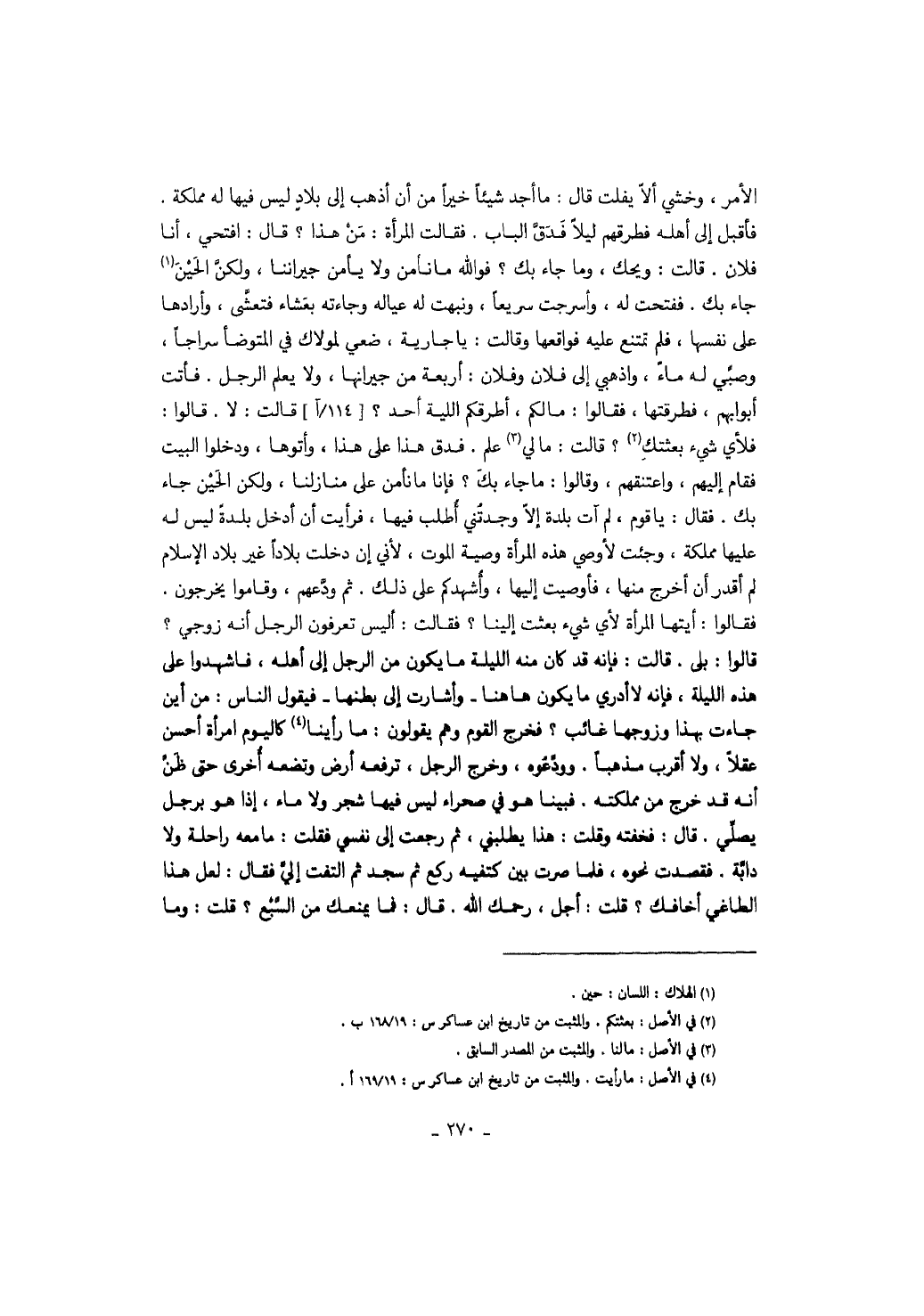 يا قوم، لم آت بلدة إلا وجدتني أطلب فيها، فرأيت أن أدخل بلدة ليس له عليها مملكة، وجئت لأوصي هذه المرأة وصية الموت، لأني إن دخلت بلاداً غير بلاد الإسلام لم أقدر أن أخرج منها، فأوصيت إلها، وأشهدكم على ذلك. ثم ودعهم، وقاموا يخرجون. فقالوا: أيتها المرأة لأي شيء بعثت إلينا؟ فقالت: أليس تعرفون الرجل أنه زوجي؟ قالوا: بلى. قالت: فإنه قد كان منه الليلة ما يكون من الرجل إلى أهله، فاشهدوا على هذه الليلة، فإنه لا أدري ما يكون ها هنا وأشارت إلى بطنها فيقول الناس: من أين جاءت بهذا وزوجها غائب؟ فخرج القوم وهم يقولون: ما رأينا كاليوم امرأة أحسن عقلاً، ولا أقرب مذهباً. وودعوه، وخرج الرجل، ترفعه أرض وتضعه أخرى حتى ظن أنه قد خرج من مملكته. فبينا هو في صحراء ليس فيها شجر ولا ماء، إذا هو برجل يصلي. فقال: فخفته وقلت: هذا يطلبني، ثم رجعت إلى نفسي فقلت: ما معه راحلة ولا دابة. فقصدت نحوه، فلما صرت بين كتفيه ركع ثم سجد ثم التفت إلي فقال: لعل هذا الطاغي أخافك؟ قلت: أجل، رحمك الله. قال: فما يمنعك من السبع؟ قلت: وما