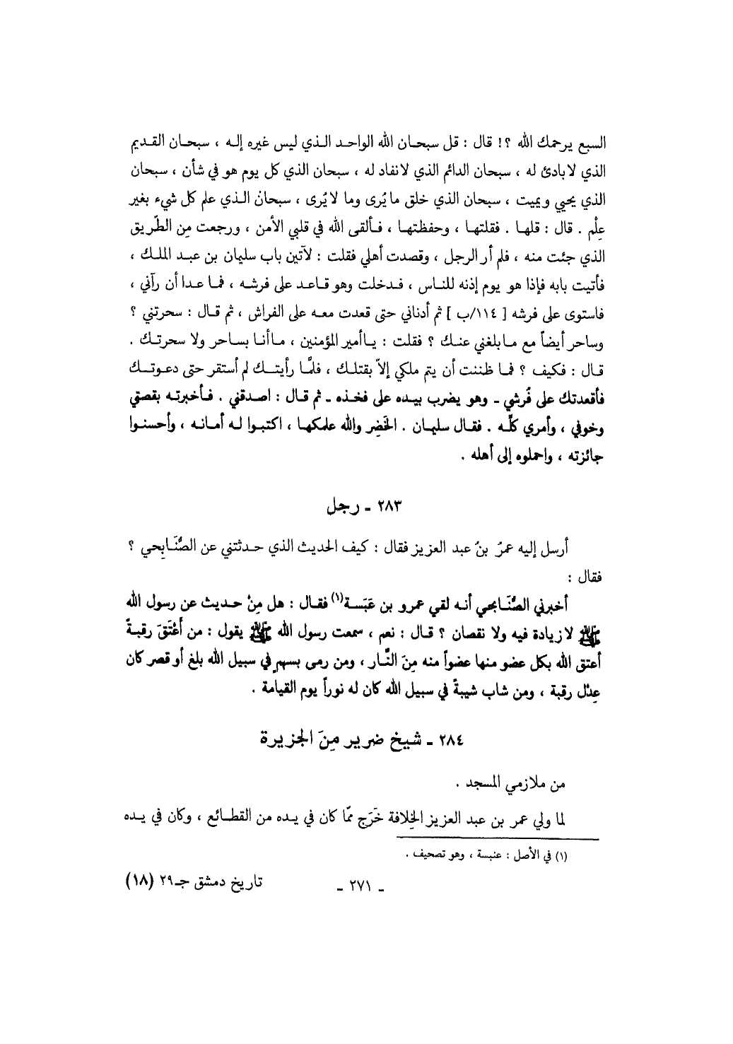 السبع يرحمك الله؟! قال: قل سبحان الله الواحد الذي ليس غيره إله، سبحان القديم الذي لا بادئ له، سبحان الدائم الذي لا نفاذ له، سبحان الدائم الذي كل يوم هو في شأن، سبحان الذي يحيي ويميت، سبحان الذي خلق ما يرى وما لا يرى، سبحان الذي علم كل شيء بغير علم. قال: قلها. فقلتها، وحفظتها، فألقى الله في قلبي الأمن، ورجعت من الطريق الذي جئت منه، فلم أر الرجل، وقصدت أهلي فقلت: لآتين باب سليمان بن عبد الملك، فأتيت بابه فإذا هو يوم إذنه للناس، فدخلت وهو قاعد على فرشه، فما عدا أن رآني، فاستوى على فرشه ثم أدناني حتى قعدت معه على الفراش، ثم قال: سحرتني؟ وساحر أيضاً مع ما بلغني عنك؟ فقلت: يا أمير المؤمنين، ما أنا بساحر ولا سحرتك. قال: فكيف؟ فما ظننت أن يتم ملكي إلا بقتلك، فلما رأيتك لم أستقر حتى دعوتك فأقعدتك على فرشي وهو يضرب بيده على فخذه ثم قال: اصدقني. فأخبرته بقصتي وخوفي، وأمري كله. فقال سليمان: الخضر والله علمكها، اكتبوا له أمانه، وأحسنوا جائزته، واحملوه إلى أهله.