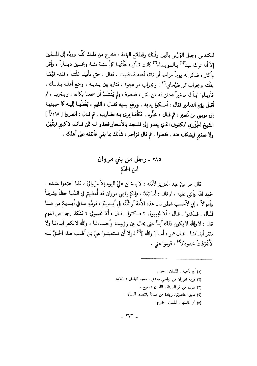 المكندس وجبل الورس باليمن وفدك وقطائع اليمامة، فخرج من ذلك كله ورده إلى المسلمين إلا أنه ترك عيناً بالسويداء كانت تأتيه غلتها كل سنة مئة وخمسين ديناراً، وأقل وأكثر، فذكر له يوماً مزاحم أن له نفقة أهله قد فنيت. فقال: حتى تأتي غلتنا، فقدم قيمه بغلته وبجراب صيحاني، وبجراب تمر عجوة، فنثره بين يديه، وسمع أهله بذلك، فأرسلوا ابناً له صغيراً فحفن له من التمر، فانصرف ولم ينشب أن سمعنا بكاءه، ويضرب، ثم أقبل يؤم الدنانير فقال: أمسكوا يديه. ورفع يديه فقال: اللهم، بغضها إليه كما حببتها إلى موسى بن نصير، ثم قال: خلوه. فكأنما يرى به عقارب. ثم قال: انظروا الشيخ الجزري المكفوف الذي يغدو إلى المسجد بالأسحار فخذوا له ثمن قائد لا كبير فيقهره ولا صغير فيضعف عنه. ففعلوا. ثم قال لمزاحم: شأنك بما بقي فأنفقه على أهلك.