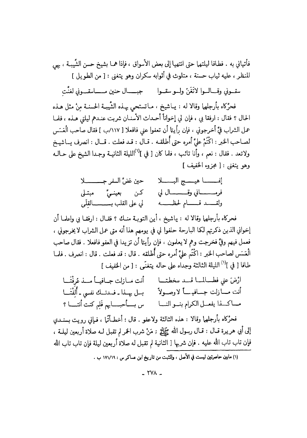 يا شيخ، ما تستحي بهذه الشيبة الحسنة من مثل هذه الحال؟ فقال: ارفقا بي، فإن لي إخواناً أحداث الأسنان شربت عندهم ليلتي هذه، فلما عمل الشراب في أخرجوني، فإن رأيتما أن تعفوا عني فافعلا فقال صاحب العسس لصاحب الخبر: اكتم علي أمره حتى أطلقه. قال: قد فعلت. قال: انصرف يا شيخ ولا تعد. فقال: نعم، وأنا تائب، فلما كان في الليلة الثانية وجدا الشيخ على حاله وهو يتغنى: مجزوء الخفيف