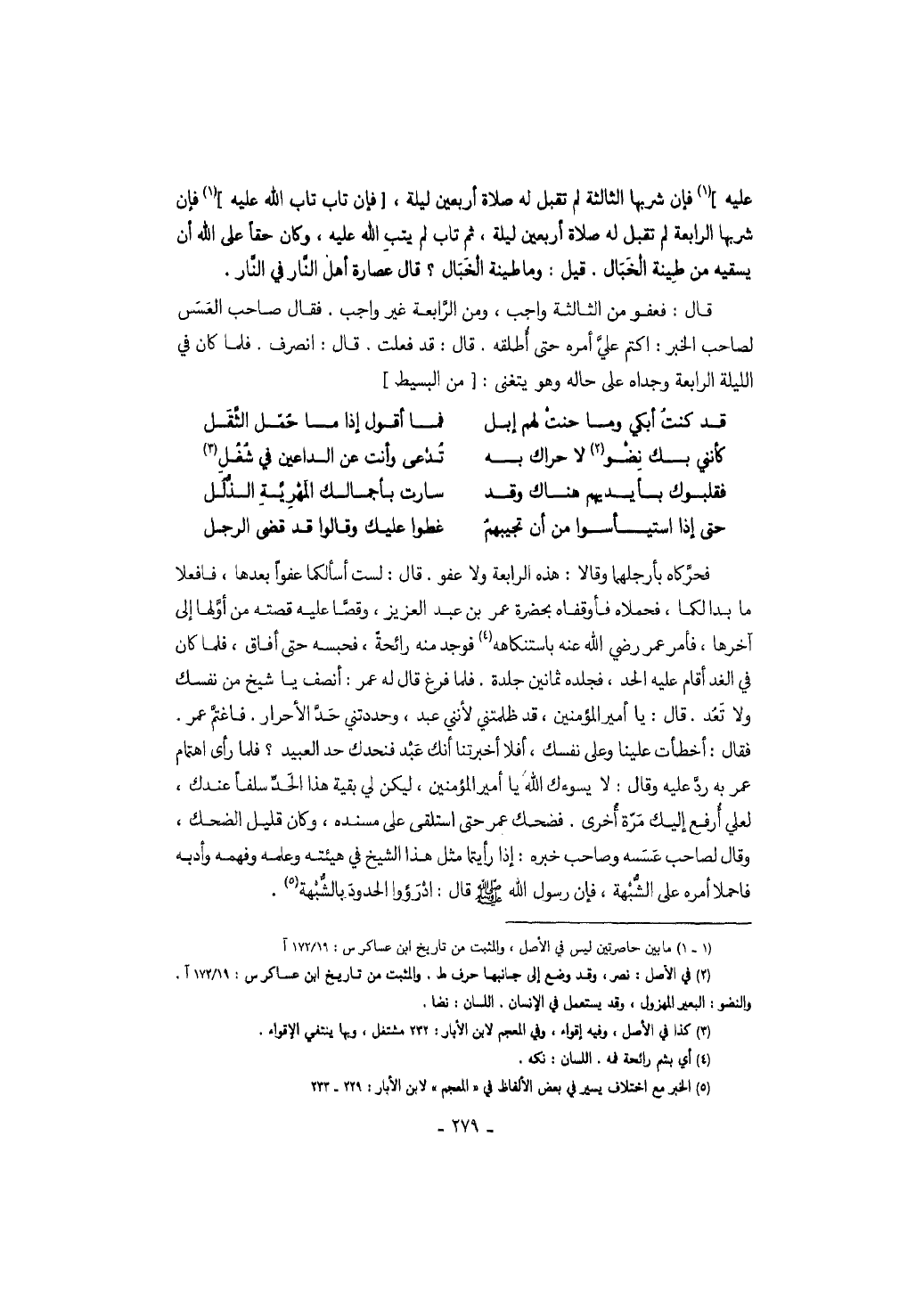 هذه الرابعة ولا عفو. قال: لست أسألكما عفواً بعدها، فافعلا ما بدا لكما، فحملاه فأوقفاه بحضرة عمر بن عبد العزيز، وقصا عليه قصته من أولها إلى آخرها، فأمر عمر رضي الله عنه باستنكاهه فوجد منه رائحة، فحبسه حتى أفاق، فلما كان في الغد أقام عليه الحد، فجلده ثمانين جلدة. فلما فرغ قال له عمر: أنصف يا شيخ من نفسك ولا تعد. قال: يا أمير المؤمنين، قد ظلمتني لأنني عبد، وحددتني حد الأحرار. فاغتم عمر. فقال: أخطأت علينا وعلى نفسك، أفلا أخبرتنا أنك عبد فنحدك حد العبيد؟ فلما رأى اهتمام عمر به رد عليه وقال: لا يسوءك الله يا أمير المؤمنين، ليكن لي بقية هذا الحد سلفاً عندك، لعلي أرفع إليك مرة أخرى. فضحك عمر حتى استلقى على مسنده، وكان قليل الضحك، وقال لصاحب عسسه وصاحب خبره: إذا رأيتما مثل هذا الشيخ في هيئته وعلمه وفهمه وأدبه فاحملا على أمره الشبهة، فإن رسول الله صَلَّى اللهُ عَلَيْهِ وَسَلَّمَ قال: ادرؤوا الحدود بالشبهة.