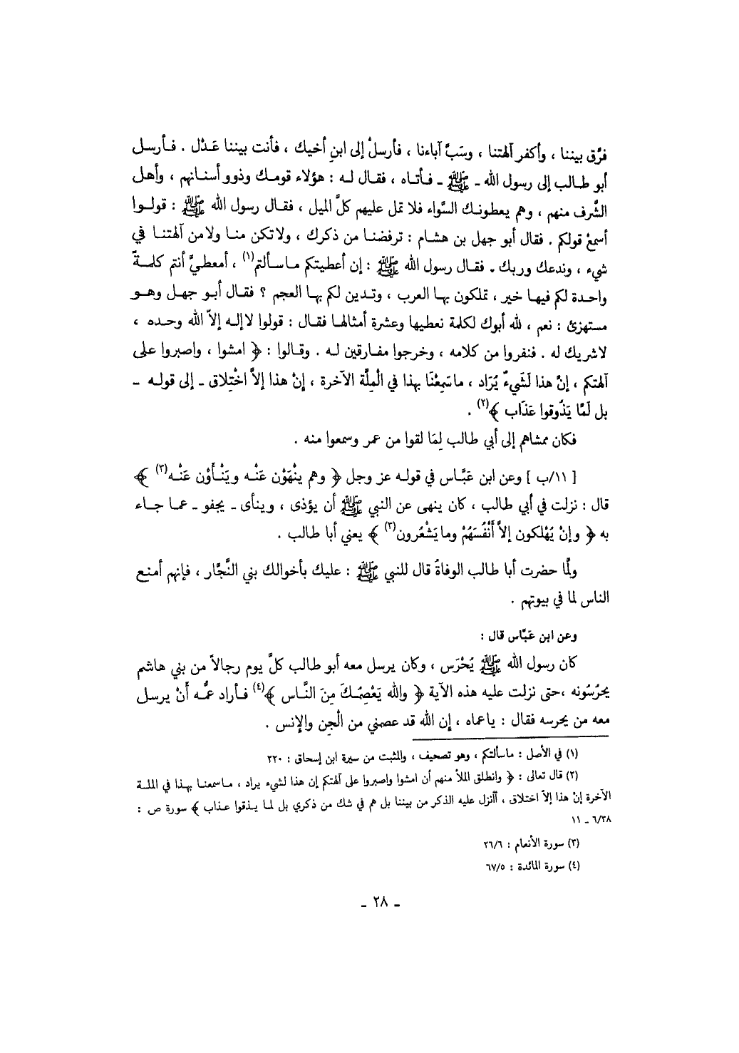 فرق بيننا، وأكفر آلهتنا، وسب آباءنا، فأرسل إلى ابن أخيك، فأنت بيننا عدل. فأرسل أبو طالب إلى رسول الله صَلَّى اللهُ عَلَيْهِ وَسَلَّمَ فأتاه، فقال له: هؤلاء قومك وذوو أسنانهم، وأهل الشرف منهم، وهم يعطونك السواء فلا تمل عليهم كل الميل، فقال رسول الله صَلَّى اللهُ عَلَيْهِ وَسَلَّمَ: قولوا أسمع قولكم. فقال أبو جهل بن هشام: ترفضنا من ذكرك، ولا تكن منا ولا من آلهتنا في شيء، وندعك وربك، فقال رسول الله صَلَّى اللهُ عَلَيْهِ وَسَلَّمَ: إن أعطيتكم ما سألتم، أمعطي أنتم كلمة واحدة لكم فيها خير، تملكون بها العرب، وتدين لكم بها العجم؟ فقال أبو جهل وهو مستهزئ: نعم، لله أبوك لكلمة نعطيها وعشرة أمثالها فقال: قولوا لا إله إلا الله وحده لا شريك له. فنفروا من كلامه، وخرجوا مفارقين له. وقالوا: " امشوا، واصبروا على آلهتكم، إن هذا لشيء يراد، ما سمعنا بهذا في الملة الآخرة، إن هذا إلا اختلاق إلى قوله بل لما يذوقوا عذاب ". فكان ممشاهم إلى أبي طالب لما لقوا من عمر وسمعوا منه. وعن ابن عباس في قوله عز وجل " وهم ينهون عنه وينأون عنه " قال: نزلت في أبي طالب، كان ينهى عن النبي صَلَّى اللهُ عَلَيْهِ وَسَلَّمَ أن يؤذى، وينأى ويجفوا عما جاء به " وإن يهلكون إلا أنفسهم وما يشعرون " يعني أبا طالب.