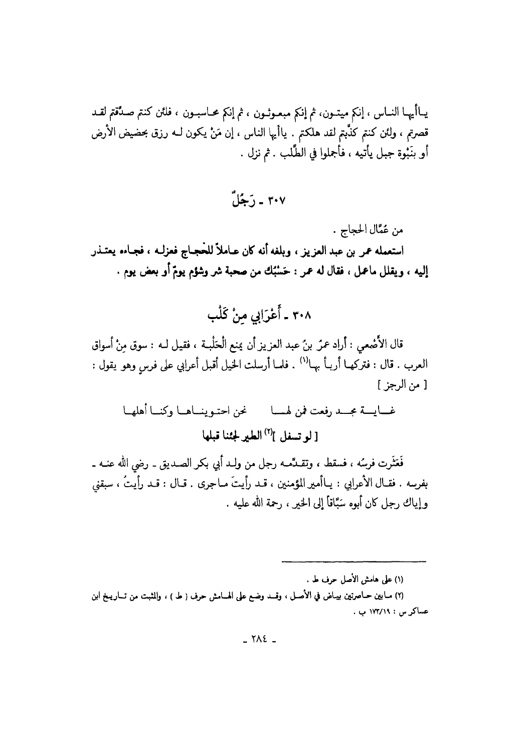 لو تسفل الطير لجئنا قبلها فعثرت فرسه، فسقط، وتقدمه رجل من ولد أبي بكر الصديق رضي الله عنه بفرسه. فقال الأعرابي: يا أمير المؤمنين، قد رأيت ما جرى. قال: قد رأيت، سبقني وإياك رجل كان أبوه سباقاً إلى الخير، رحمة الله عليه.