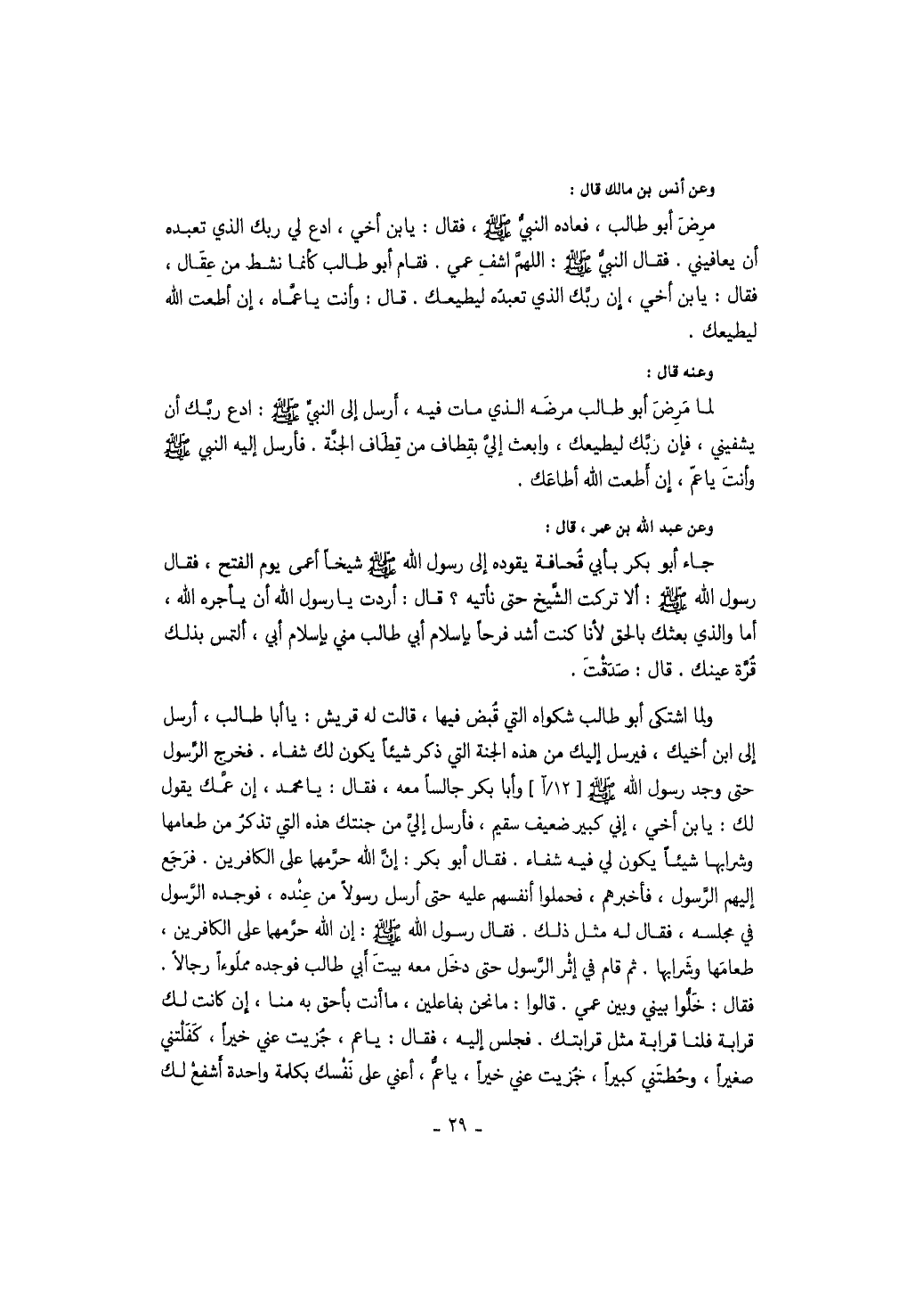 وعن أنس بن مالك قال: مرض أبو طالب، فعاده النبي صَلَّى اللهُ عَلَيْهِ وَسَلَّمَ، فقال: يا بن أخي، ادع لي ربك الذي تعبده أن يعافيني. فقال النبي صَلَّى اللهُ عَلَيْهِ وَسَلَّمَ: اللهم اشف عمي. فقام أبو طالب كأنما نشط من عقال، فقال: يا بن أخي، إن ربك الذي تعبده ليعطيك. قال: وأنت يا عماه، إن أطعت الله ليعطيك. وعنه قال: لما مرض أبو طالب مرضه الذي مات فيه، أرسل إلى النبي صَلَّى اللهُ عَلَيْهِ وَسَلَّمَ: ادع ربك أن يشفيني، فإن ربك ليعطيك، وابعث إلي بقطاف من قطاف الجنة. فأرسل إليه النبي صَلَّى اللهُ عَلَيْهِ وَسَلَّمَ وأنت يا عم، إن أطعت الله أطاعك. وعن عبد الله بن عمر، قال: جاء أبو بكر بأبي قحافة يقوده إلى رسول الله صَلَّى اللهُ عَلَيْهِ وَسَلَّمَ شيخاً أعمى يوم الفتح، فقال رسول الله صَلَّى اللهُ عَلَيْهِ وَسَلَّمَ: ألا تركت الشيخ حتى نأتيه؟ قال: أردت يا رسول الله أن يأجره الله، أما والذي بعثك بالحق لأنا كنت أشد فرحاً بإسلام أبي طالب مني بإسلام أبي، ألتمس بذلك قرة عينك. قال: صدقت. ولما اشتكى أبو طالب شكواه التي قبض فيها، قالت له قريش: يا أبا طالب، أرسل إلى ابن أخيك، فيرسل إليك من هذه الجنة التي ذكر شيئاً يكون لك شفاء. فخرج الرسول حتى وجد رسول الله صَلَّى اللهُ عَلَيْهِ وَسَلَّمَ وأبا بكر جالساً معه، فقال: يا محمد، إن عمك يقول لك: يا بن أخي، إني كبير ضعيف سقيم، فأرسل إلي من جنتك هذه التي تذكر من طعامها وشرابها شيئاً يكون لي فيه شفاء. فقال أبو بكر: إن الله حرمهما على الكافرين. فرجع إليهم الرسول، فأخبرهم، فحملوا أنفسهم عليه حتى أرسل رسولاً من عنده، فوجده الرسول في مجلسه، فقال له مثل ذلك. فقال رسول الله صَلَّى اللهُ عَلَيْهِ وَسَلَّمَ: إن الله حرمهما على الكافرين، طعامها وشرابها. ثم قام في إثر الرسول حتى دخل معه بيت أبي طالب فوجده مملوءاً رجالاً. فقال: خلوا بيني وبين عمي. قالوا: ما نحن بفاعلين، ما أنت بأحق به منا، إن كانت لك قرابة فلنا قرابة مثل قرابتك. فجلس إليه، فقال: يا عم، جزيت عني خيراً، كفلتني صغيراً وحطتني كبيراً، جزيت عني خيراً، يا عم، أعني على نفسك بكلمة واحدة أشفع لك