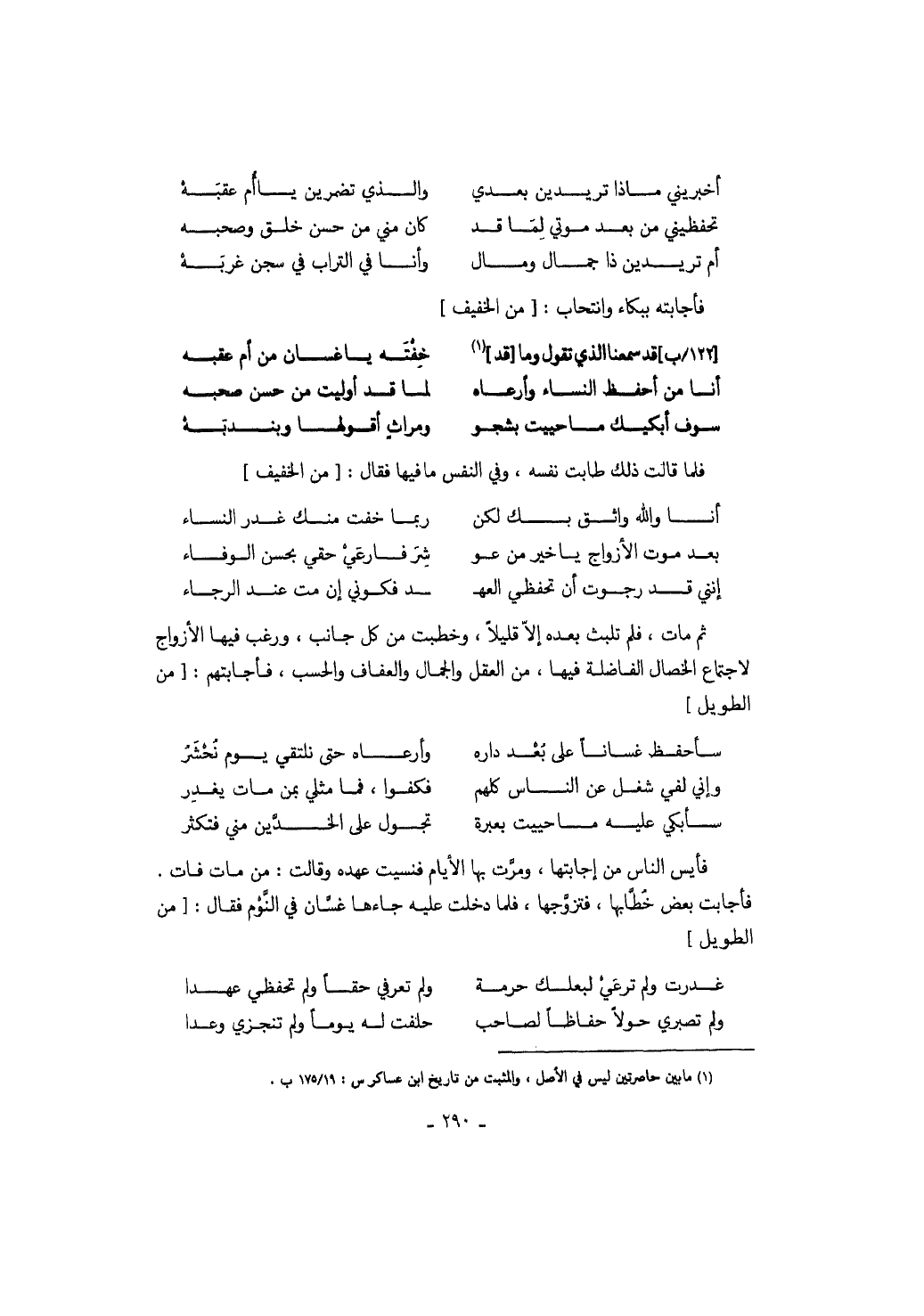 ثم مات، فلم تلبث بعده إلا قليلاً، وخطبت من كل جانب، ورغب فيها الأزواج لاجتماع الخصال الفاصلة فيها، من العقل والجمال والعفاف والحسب، فأجابتهم: من الطويل