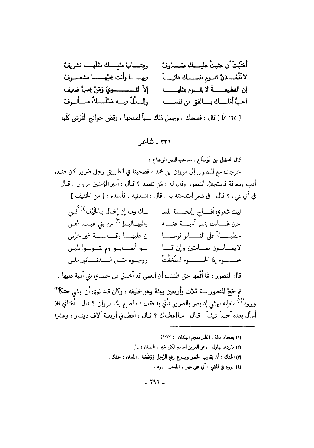 قال الفضل بن الوضاح، صاحب قصر الوضاح: خرجت مع المنصور إلى مروان بن محمد، فصحبنا في الطريق رجل ضرير كان عنده أدب ومعرفة فاستجلاه المنصور وقال له: من تقصد؟ قال: أمير المؤمنين مروان. قال: في أي شيء؟ قال: في شعر أمتدحه به. قال: أنشدنيه. فأنشده: من الخفيف