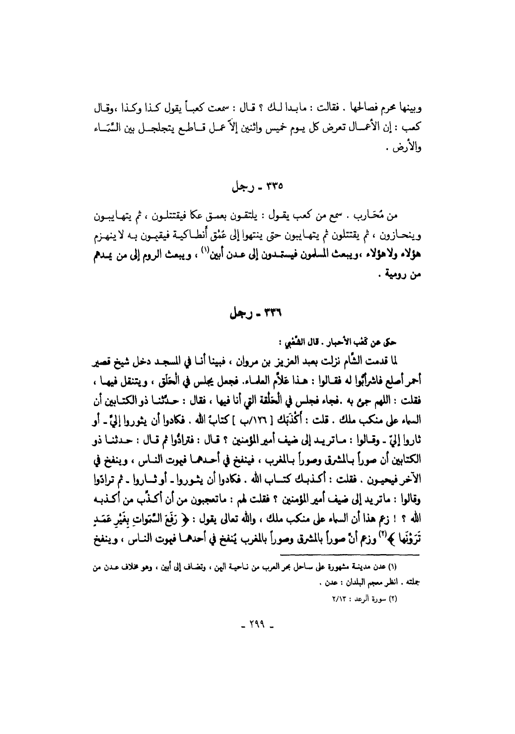 سمع من كعب يقول: يلتقون بعمق عكا فيقتتلون، ثم يتهايبون وينحازون، ثم يقتتلون ثم يتهايبون حتى ينتهوا إلى عمق إنطاكية فيقيمون به لا ينهزم هؤلاء ولا هؤلاء، ويبعث المسلمون فيستمدون إلى عدن أبين، ويبعث الروم إلى من يمدهم من رومية.