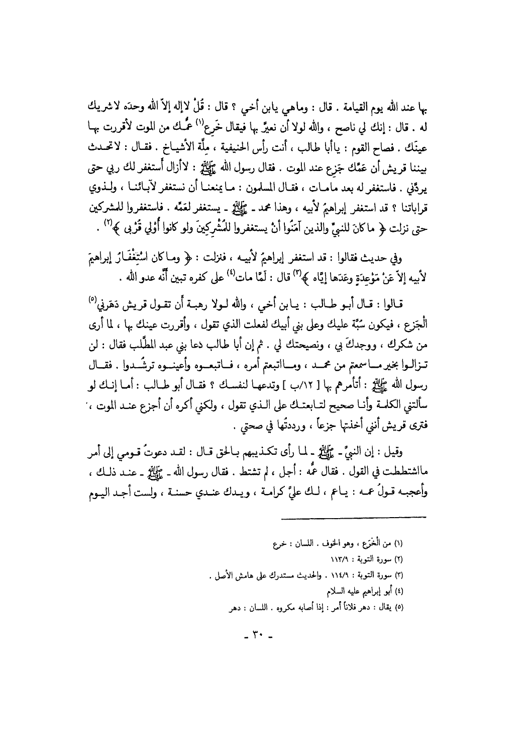 بها عند الله يوم القيامة. قال: وما هي يا بن أخي؟ قال: قل لا إله إلا الله وحده لا شريك له. قال: إنك لي ناصح، والله لولا أن نعير بها فيقال خرع عمك من الموت لأقررت بها عينك. فصاح القوم: يا أبا طالب، أنت رأس الحنيفية، ملة الأشياخ. فقال: لا تحدث بيننا قريش أن عمك جزع عند الموت. فقال رسول الله صَلَّى اللهُ عَلَيْهِ وَسَلَّمَ: لا أزال أستغفر لك ربي حتى يردني. فاستغفر له بعد ما مات، فقال المسلمون: ما يمنعنا أن نستغفر لآبائنا، ولذوي قرابتنا؟ قد استغفر إبراهيم لأبيه، وهذا محمد صَلَّى اللهُ عَلَيْهِ وَسَلَّمَ يستغفر لعمه. فاستغفروا للمشركين حتى نزلت " ما كان للنبي والذين آمنوا أن يستغفروا للمشركين ولو كانوا أولي قربى ". وفي حديث فقالوا: قد استغفر إبراهيم لأبيه، فنزلت: " وما كان استغفار إبراهيم لأبيه إلا عن موعدة وعدها إياه " قال: لما مات على كفره تبين أنه عدو الله. قالوا: قال أبو طالب: