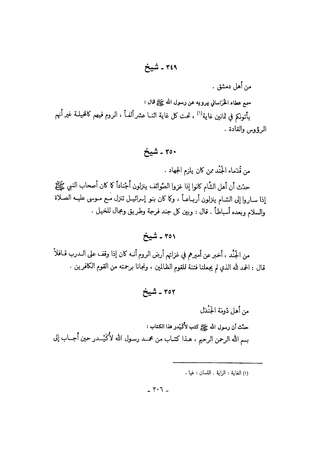سمع عطاء الخراساني يرويه عن رسول الله صَلَّى اللهُ عَلَيْهِ وَسَلَّمَ قال: يأتونكم في ثمانين غاية، تحت كل غاية إثنا عشر ألفاً، الروم فيهم كالمخيلة غير أنهم الرؤوس والقادة.