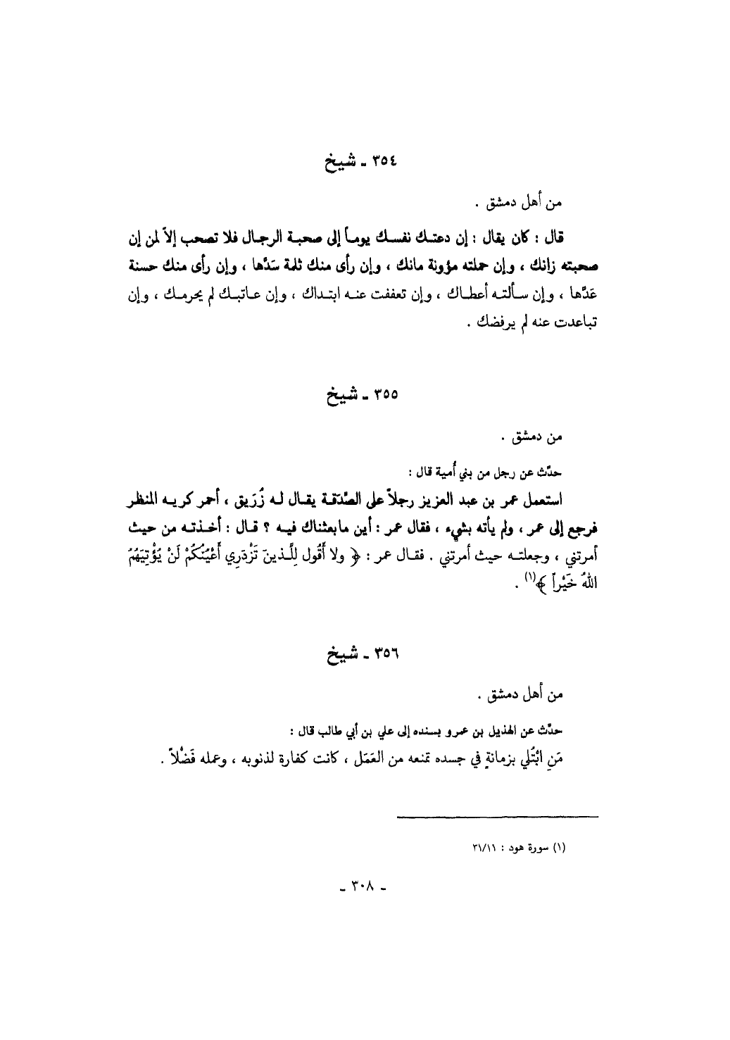 قال: كان يقال: إن دعتك نفسك يوماً إلى صحبة الرجال فلا تصحب إلا لمن صحبته زانك، وإن حملته مؤونة مانك، وإن رأى منك ثلمة سدها، وإن رأى منك حسنة عدها، وإن سألته أعطاك، وإن تعففت عنه ابتداك، وإن عاتبك لم يحرمك، وإن تباعدت عنه لم يرفضك.
