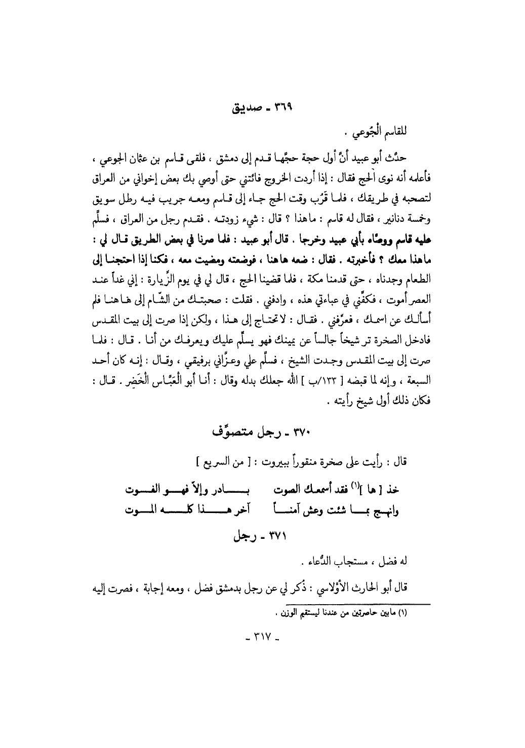 رجل من العراق، فسلم عليه قاسم ووصاه بأبي عبيد وخرجا. قال أبو عبيد: فلما صرنا في بعض الطريق قال لي: ما هذا معك؟ فأخبرته. فقال: ضعه هاهنا، فوضعته ومضيت معه، فكنا إذا احتجنا إلى الطعام وجدناه، حتى قدمنا مكة، فلما قضينا الحج، قال لي في يوم الزيارة: إني غداً عند العصر أموت، فكفني في عباءتي هذه، وادفني. فقلت: صحبتك من الشام إلى هاهنا فلم أسألك عن اسمك، فعرفني. فقال: لا تحتاج إلى هذا، ولكن إذا صرت إلى بيت المقدس فادخل الصخرة تر شيخاً جالساً عن يمينك فهو يسلم عليك ويعرفك من أنا. قال: فلما صرت إلى بيت المقدس وجدت الشيخ، فسلم علي وعزاني برفيقي، وقال: إنه كان أحد السبعة، وإنه لما قبضه الله جعلك بدله وقال: أنا أبو العباس الخضر. قال: فكان ذلك أول شيخ رأيته.