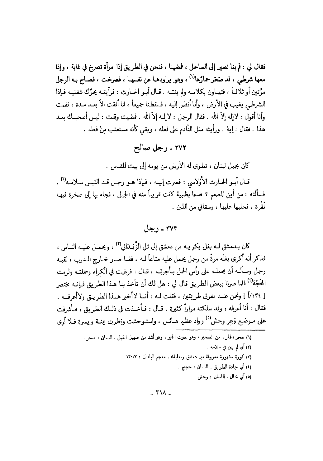 كان بدمشق له بغل يكريه من دمشق إلى تل الزبداني، ويحمل عليه الناس، فذكر أنه أكرى بغلة مرة من رجل يحمل عليه متاعاً له، فلما صار خارج الدرب، لقيه رجل وسأله أن يحمله على رأس الحمل بأجرته، قال: فرغبت في الكراء وحملته ولزمت المحجة فلما صرنا ببعض الطريق قال لي: هل لك أن تأخذ بنا هذا الطريق فإنه مختصر ونحن عند مفرق طريقين، فقلت له: أنا لا أخبر هذا الطريق ولا أعرفه. فقال: أنا أعرفه، وقد سلكته مراراً كثيرة. قال: فأخذت الطريق، فأشرفت على موضع وعر وحش وواد عظيم هائل، واستوحشت ونظرت يمنة ويسرة فلا أرى