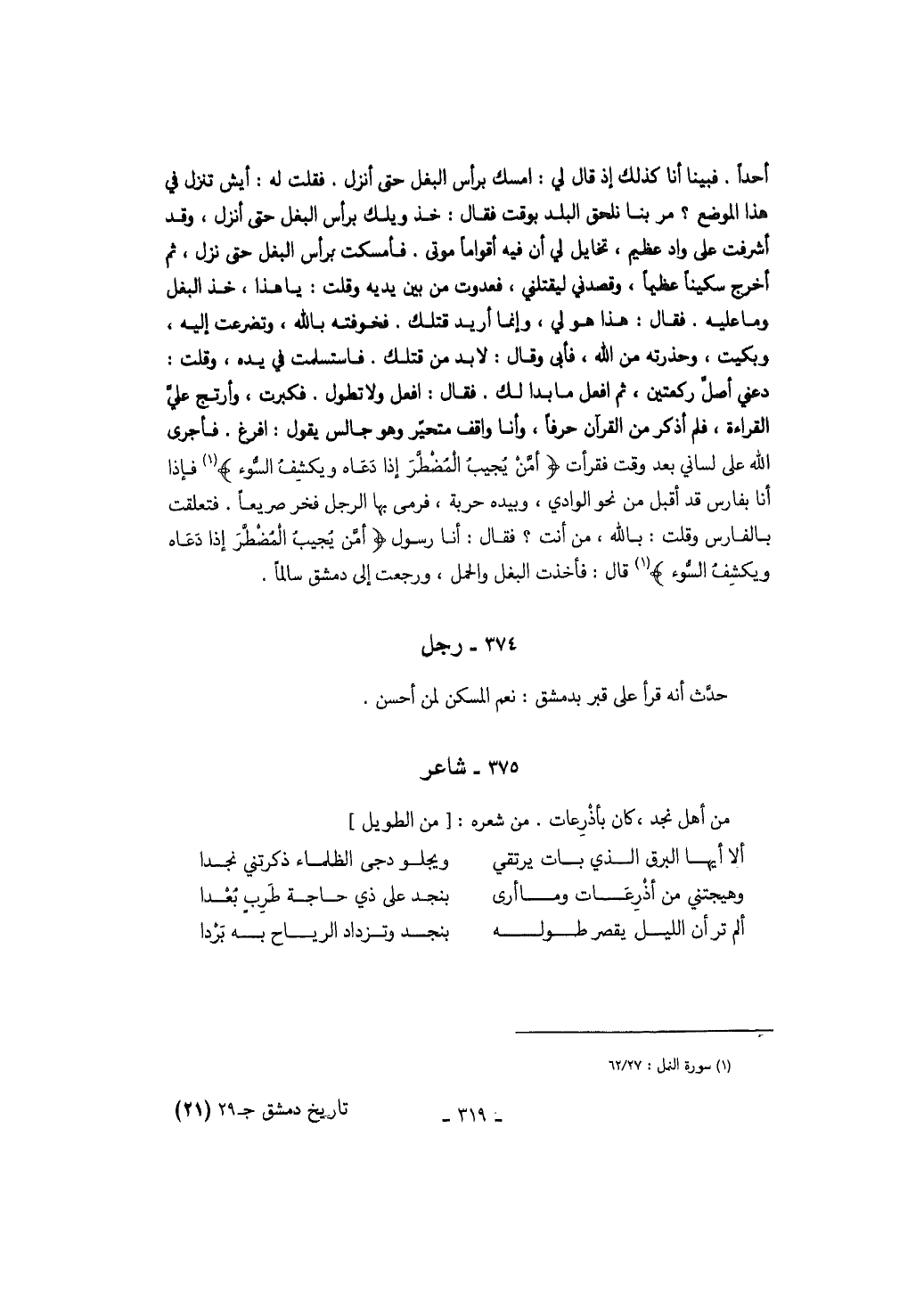 رجل فخر صريعاً. فتعلقت بالفارس وقلت: بالله، من أنت؟ فقال: أنا رسول " أمن يجيب المضطر إذا دعاه ويكشف السوء " قال: فأخذت البغل والحمل، ورجعت إلى دمشق سالماً.