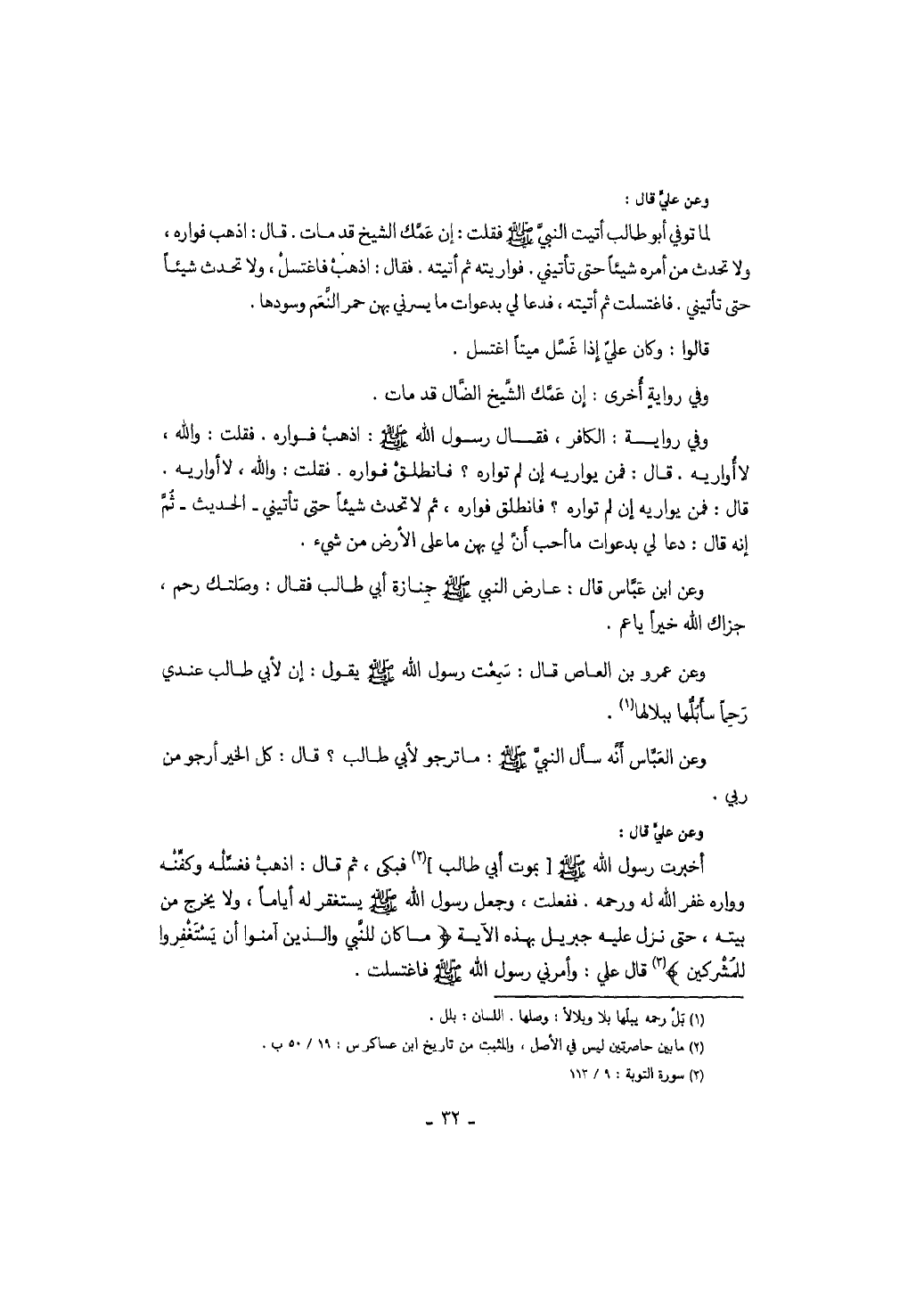 وعن علي قال: لما توفي أبو طالب أتيت النبي صَلَّى اللهُ عَلَيْهِ وَسَلَّمَ فقلت: إن عمك الشيخ قد مات. قال: اذهب فواره، ولا تحدث من أمره شيئاً حتى تأتيني. فواريته ثم أتيته. فقال: اذهب فاغتسل، ولا تحدث شيئاً حتى تأتيني. فاغتسلت ثم أتيته، فدعا لي بدعوات ما يسرني بهن حمر النعم وسودها. قالوا: وكان علياً إذا غسل ميتاً اغتسل. وفي رواية أخرى: إن عمك الشيخ الضال قد مات. وفي رواية: الكافر، فقال رسول الله صَلَّى اللهُ عَلَيْهِ وَسَلَّمَ: اذهب فواره. فقلت: والله لا أواريه. قال: فمن يواريه إن لم تواره؟ فانطلق فواره، فقلت له: والله، لا أواريه. فقال: فمن يواريه إن لم تواره؟ فانطلق فواره، ثم لا تحدث شيئاً حتى تأتيني الحديث ثم إنه قال: دعا لي بدعوات ما أحب لي بهن ما على الأرض من شيء. وعن ابن عباس قال: عارض النبي صَلَّى اللهُ عَلَيْهِ وَسَلَّمَ جنازة أبي طالب فقال: وصلتك رحم، جزاك الله خيراً يا عم. وعن عمرو بن العاص قال: سمعت رسول الله صَلَّى اللهُ عَلَيْهِ وَسَلَّمَ يقول: إن لأبي طالب عندي رحماً سأبلها ببلاها.