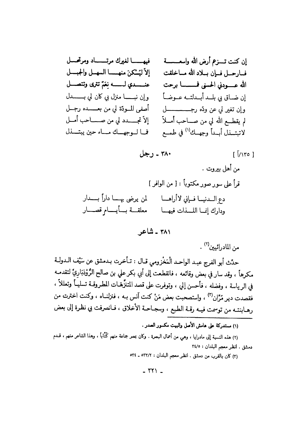 حدث أبو الفرج عبد الواحد المخزومي قال: تأخرت بدمشق عن سيف الدولة مكرهاً، وقد سار في بعض وقائعه، فانقطعت إلى أبي بكر علي بن صالح الروذباري لتقدمه في الرياسة، وفضله، فأحسن إلي، وتوفرت على قصد المتنزهات المطروقة تسلياً وتعللاً، فقصدت دير مران، واستصحبت بعض من كنت آنس به، فنزلناه، وكنت اخترت من رهابنته من توسمت فيه رقة الطبع، وسجاحة الأخلاق، فانصرفت بي نظرة إلى بعض