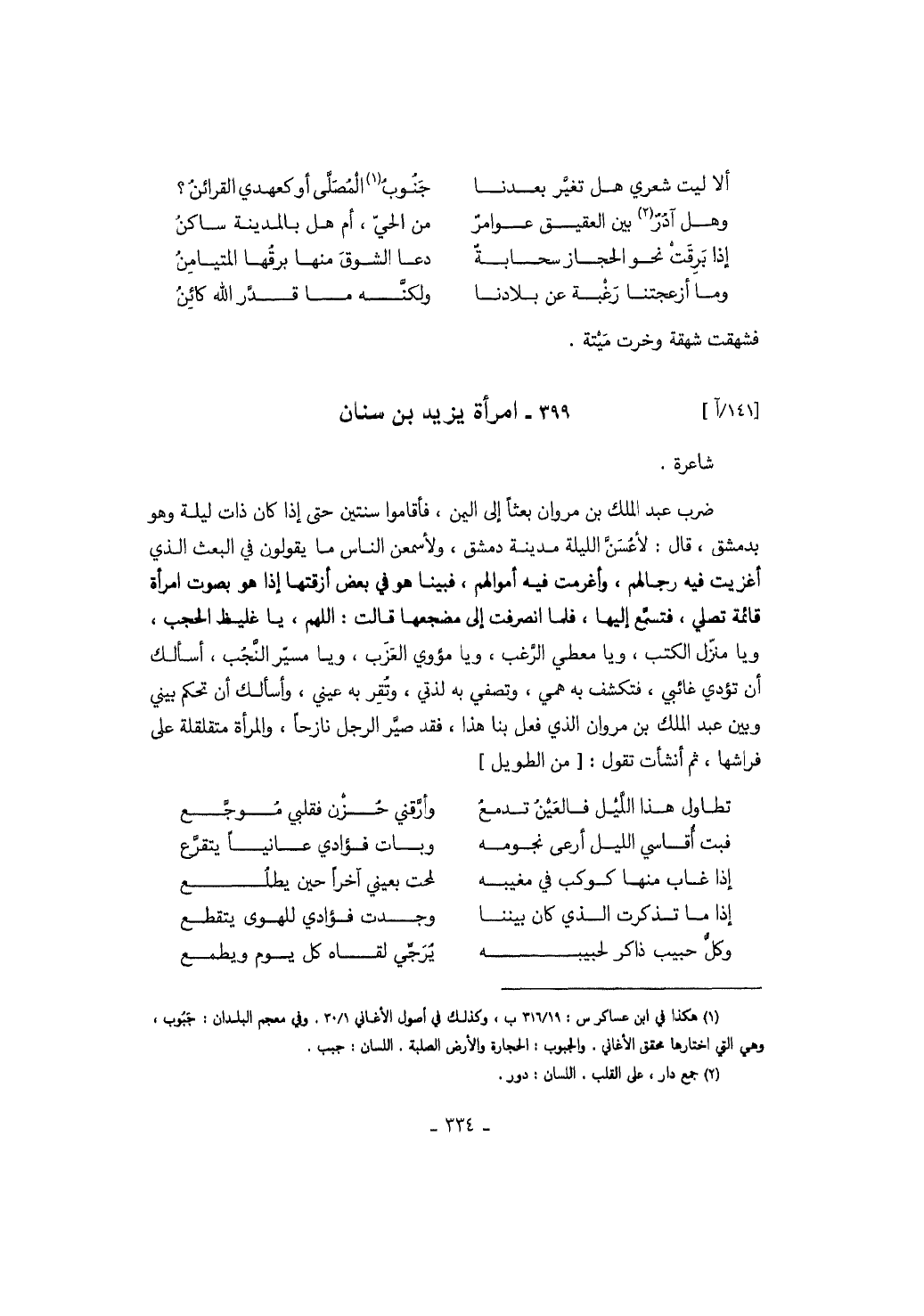 شاعرة. ضرب عبد الملك بن مروان بعثاً إلى اليمن، فأقاموا سنتين حتى إذا كان ذات ليلة وهو بدمشق، قال: لأعسن الليلة مدينة دمشق، ولأسمعن الناس ما يقولون في البعث الذي أغزيت فيه رجالهم، وأغرمت فيه أموالهم، فبينا هو في بعض أزقتها إذا هو بصوت امرأة قائمة تصلي، فتسمع إليها، فلما انصرفت إلى مضجعها قالت: اللهم، يا غليظ الحجب، ويا منزل الكتب، ويا معطي الرغب، ويا مؤوي العزب، ويا مسير النجب، أسألك أن تؤدي غائبي، فتكشف به همي، وتصفي به لذتي، وتقر به عيني، وأسألك أن تحكم بيني وبين عبد الملك بن مروان الذي فعل بنا هذا، فقد صير الرجل نازحاً، والمرأة متقلقلة على فراشها، ثم أنشدت تقول: من الطويل
