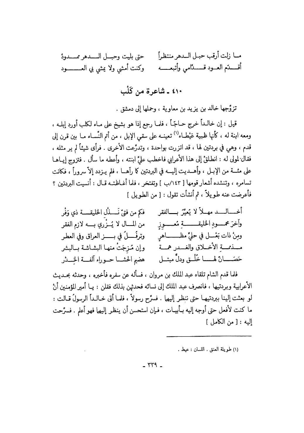 فلما قدم الشام تلقله عبد الملك بن مروان، فسأله عن سفره فأخبره، وحدثه بحديث الأعرابية وبردتيها، فانصرف عبد الملك إلى نسائه فحدثهن بذلك فقلن: يا أمير المؤمنين أن لو بعثت إلينا ببردتيها حتى ننظر إليهما. فسرح رسولاً، فلما أتى خالداً الرسول قالت: ما كنت لأفعل حتى أوجه إليه بأبيات، فإن استحسن أن ينظر إليهما فهو أعلم. فسرحت إليه: من الكامل